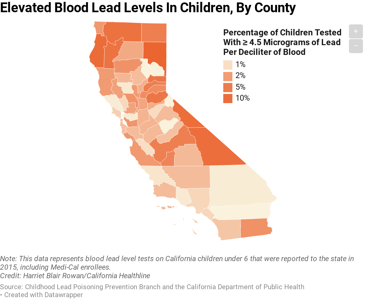 More than 5% of children under age 6 in nine mostly rural California counties had blood lead levels in 2015 that put them above state and federal reporting guidelines for lead exposure — at least 4.5 micrograms of lead per deciliter of blood — according to the most detailed data from the California Department of Public Health. Across the state, 1.4% of children who were tested, or about 7,650 kids, had elevated blood lead levels that year.