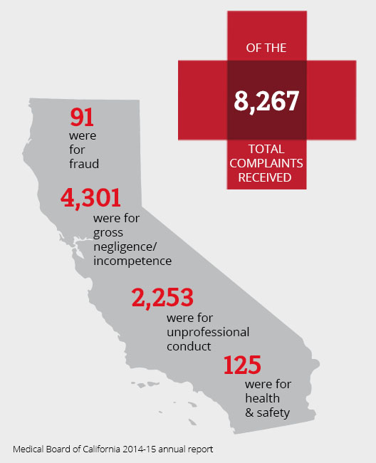 In 2014-15, there were 8,267 complaints made about physicians and surgeons in California, according to the Medical Board of California’s annual report. That number represented a slight dip from 2013-14, when there were 8,329 complaints.