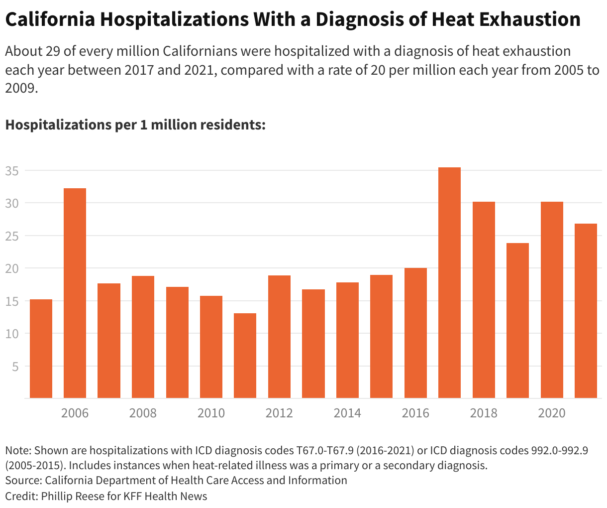 In California, hospitalizations involving a diagnosis of heat-related illness spiked from 2017 through 2021, rising to levels not seen since the state’s infamous 2006 heat wave, according to the most recent data from the state Department of Health Care Access and Information. Hospitalization data for 2022 is not yet available. Emergency room visits for heat-related illness have also trended higher, in California and nationwide.