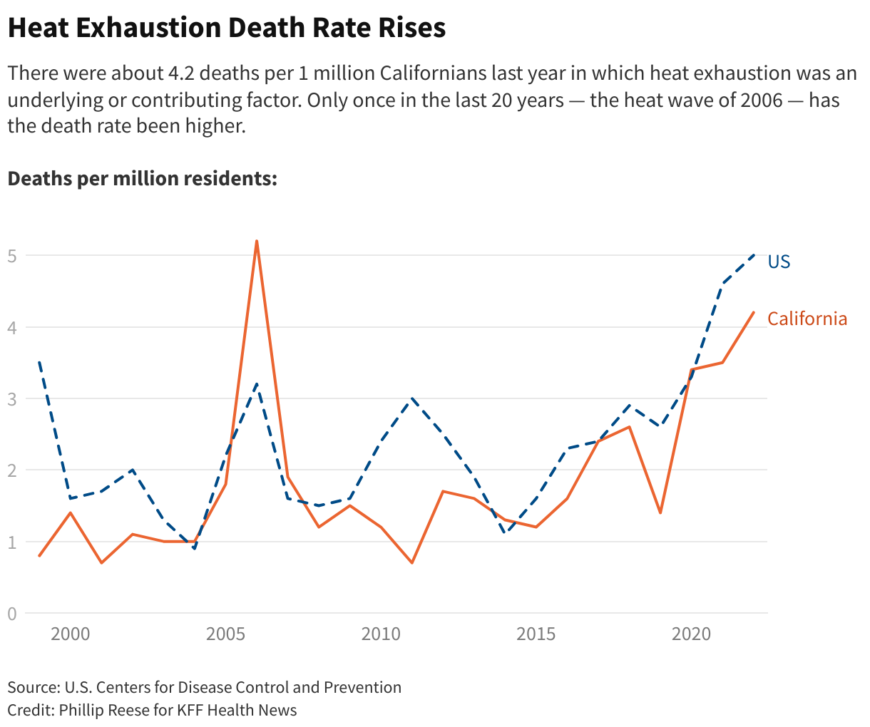 And the numbers tell only part of the story: Heat-related illness is often underdiagnosed. A 2021 Los Angeles Times investigation found that the true number of excess deaths and hospitalizations during a heat wave is often much higher than the official count.