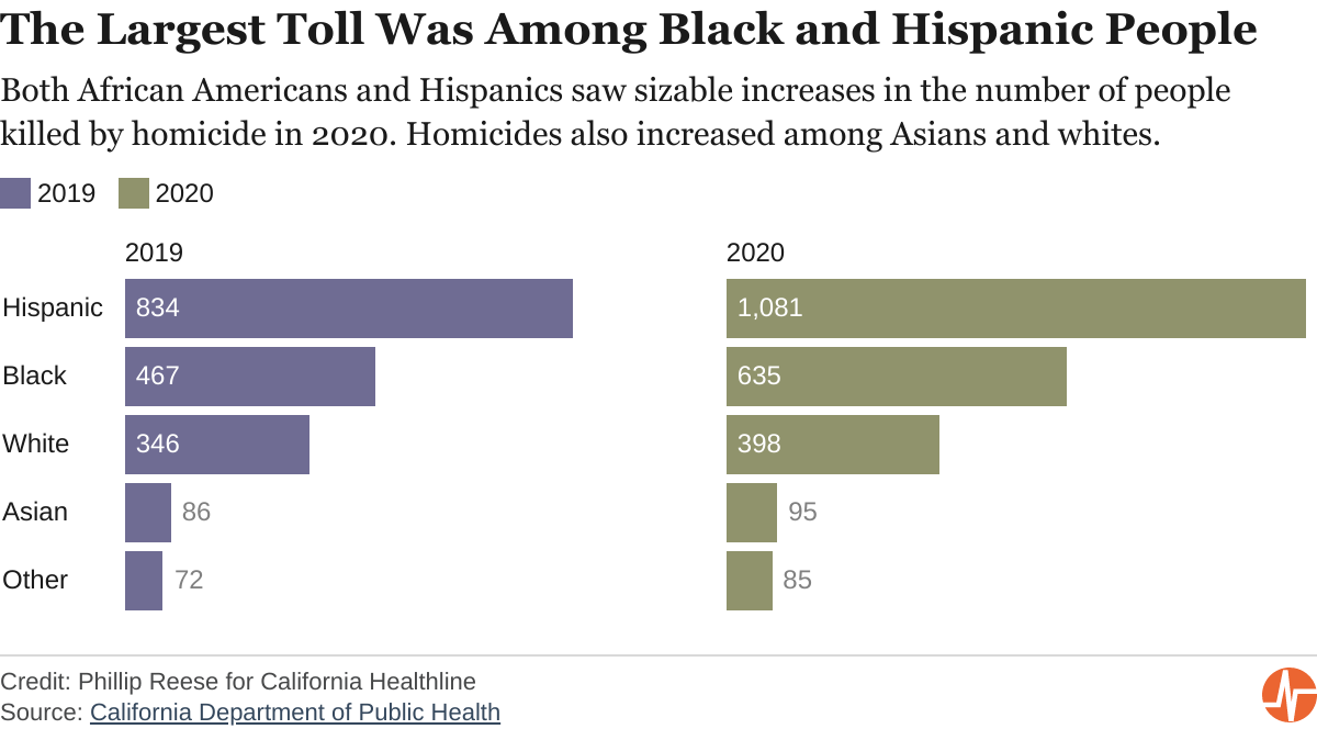 The number of homicides that took the lives of Black Californians rose 36% from 2019 to 2020, while homicides that took Hispanic lives rose 30%. By comparison, the number of white homicide victims rose 15% and the number of Asian victims rose 10%.
