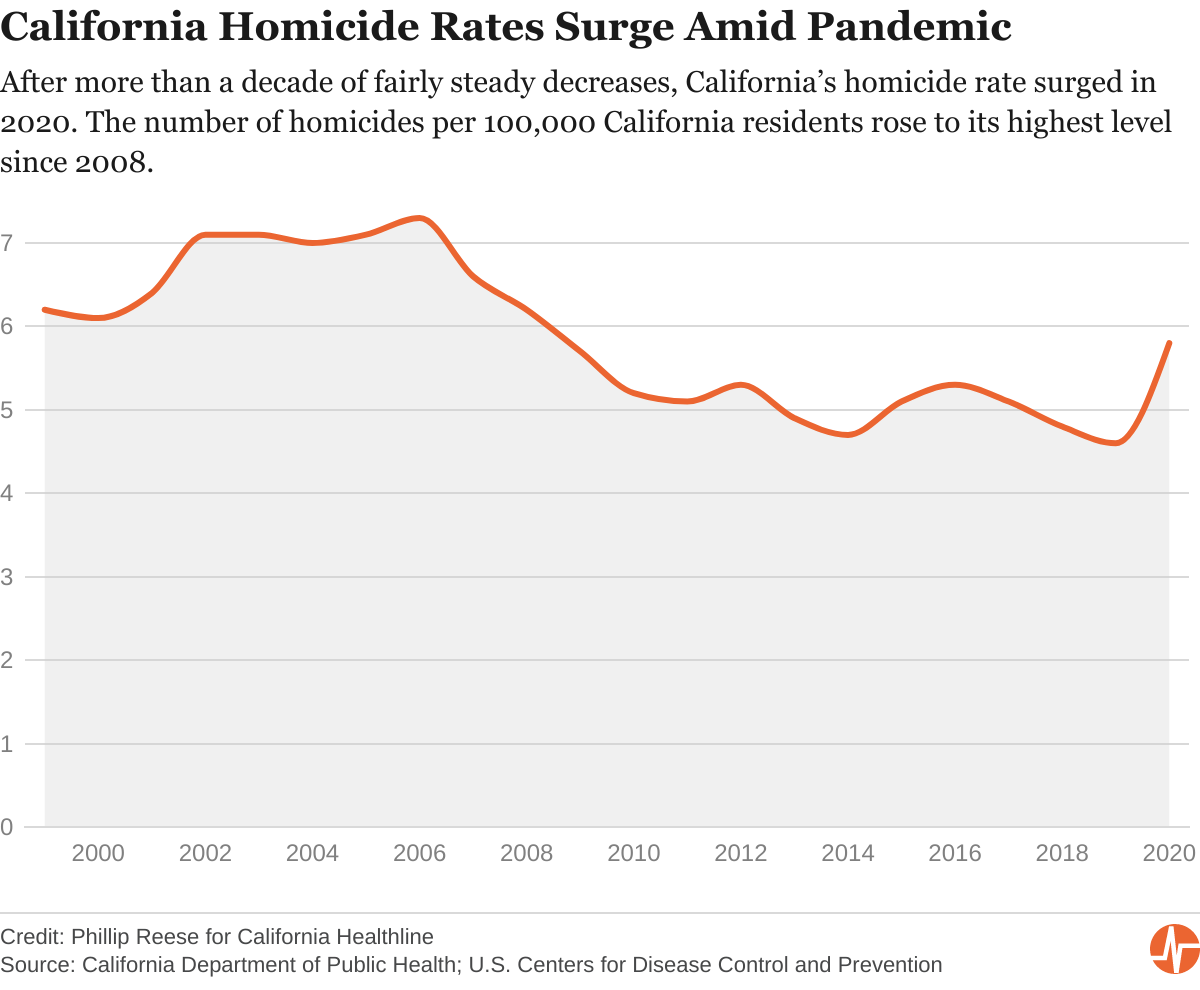 There were 5.8 homicides per 100,000 residents in 2020, the highest rate in California since 2008.