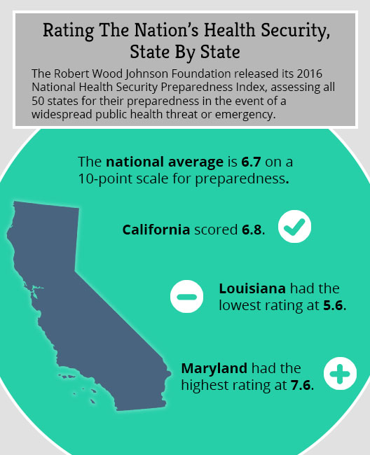 On a 10-point scale, California received a score of 6.8 in the 2016 National Health Security Preparedness Index. The national average was 6.7.