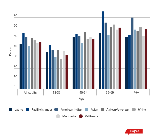 Prediabetes disproportionately affects certain racial and ethnic groups. In California, at least half of Pacific Islanders, American Indians and African-Americans are estimated to have prediabetes, as shown in the graph above. According to the same data collected in the 2013-14 California Health Interview Survey, more than one-third of Latinos, Pacific Islanders, American Indians, African-Americans and those of multiple races aged 18-39 are estimated to have prediabetes.