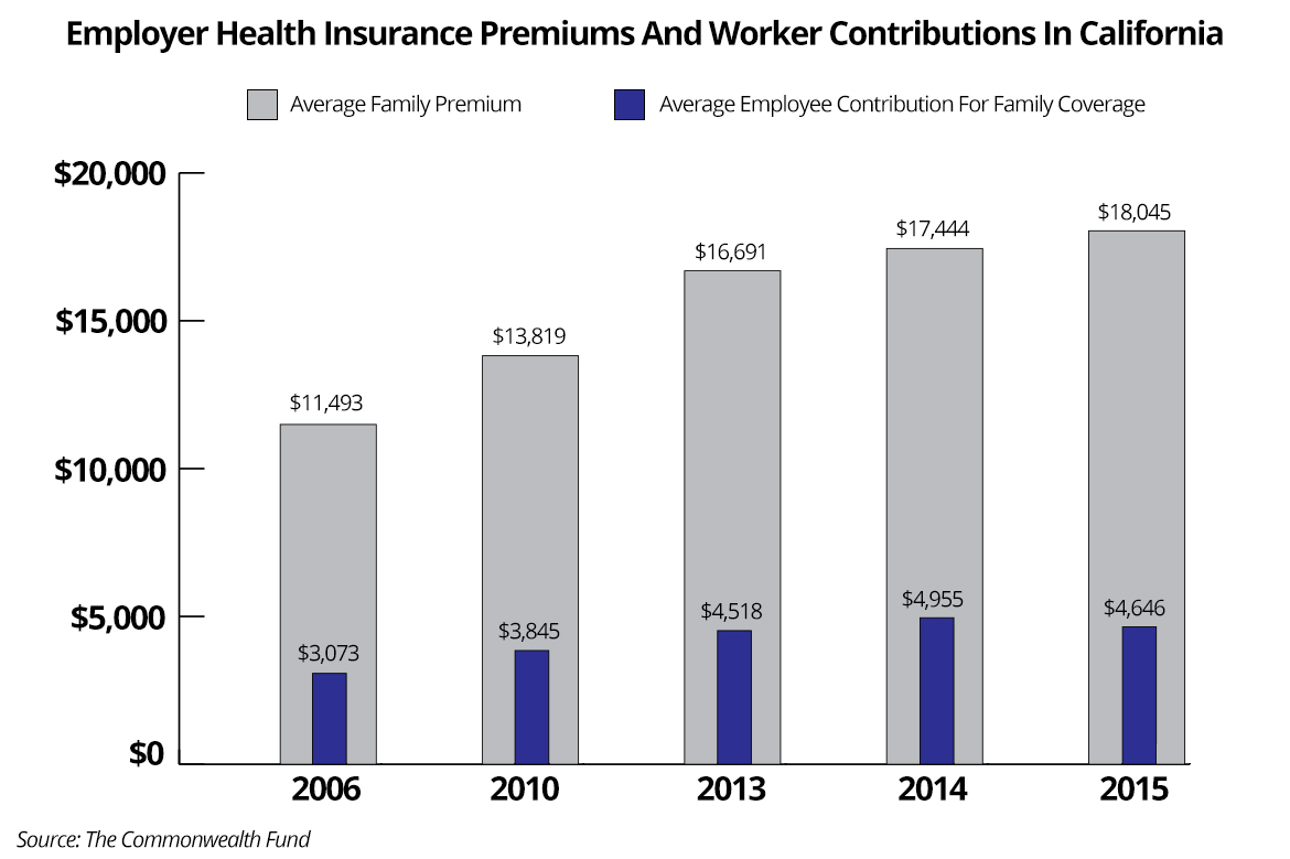 According to data from the Commonwealth Fund, the average annual cost of covering a family under an employer health plan in California rose 57 percent, or $6,552, from 2006 to 2015. The average employee contribution to those plans rose by 51 percent, or $1,573, during the same period — though it dropped 6.2 percent, or $309, in 2015.