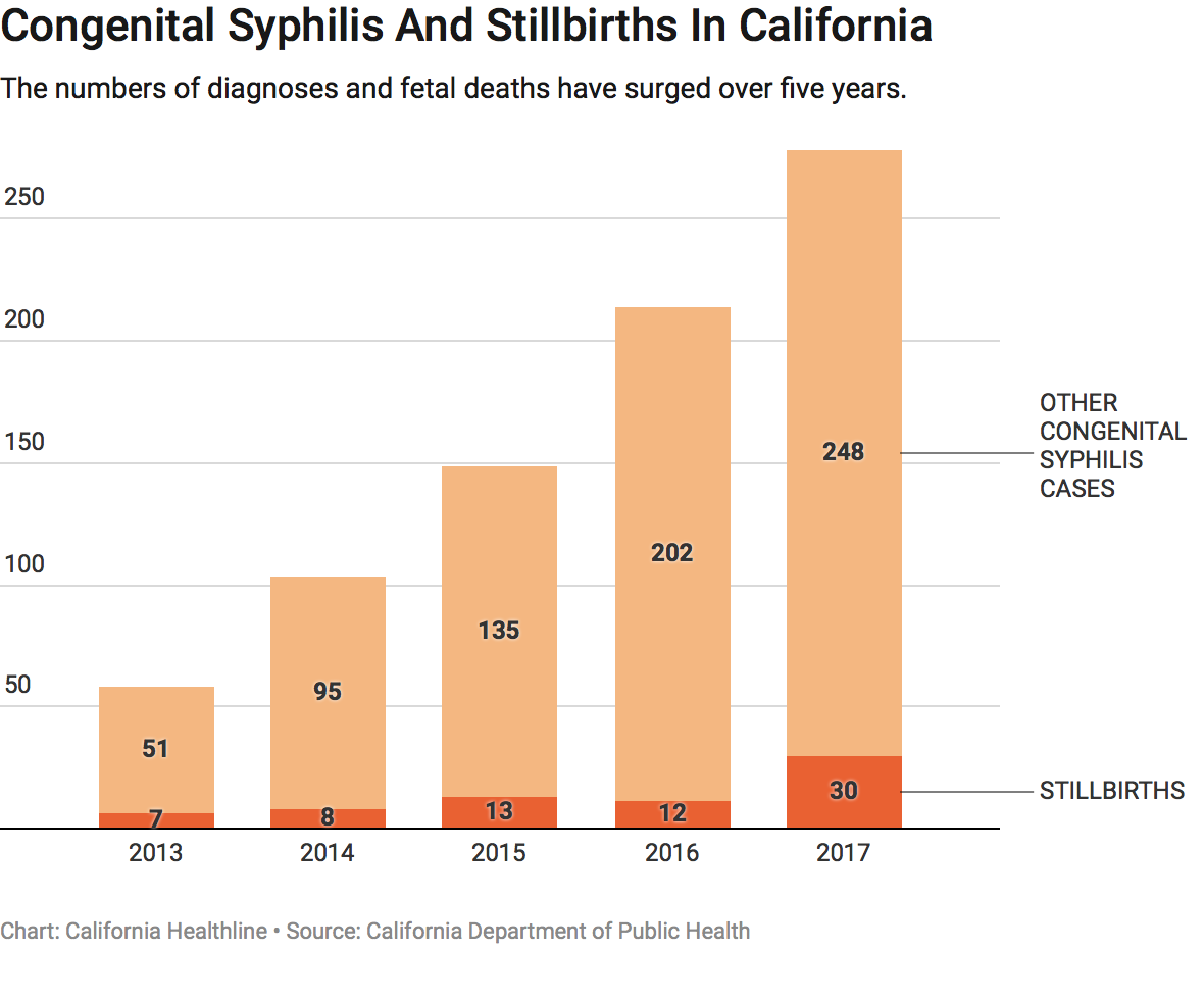 Some of those cases had tragic endings: Thirty of the 278 babies affected by congenital syphilis in 2017 were stillbirths, the highest number in 22 years. Congenital syphilis occurs when syphilis passes from a pregnant woman to her fetus.