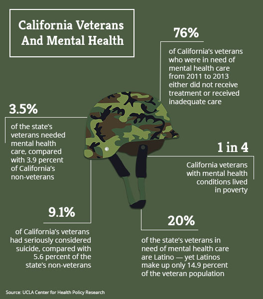 - About 20 percent of the state’s veterans in need of mental health care are Latino, despite the fact that Latinos comprise only 14.9 percent of the state’s veteran population.