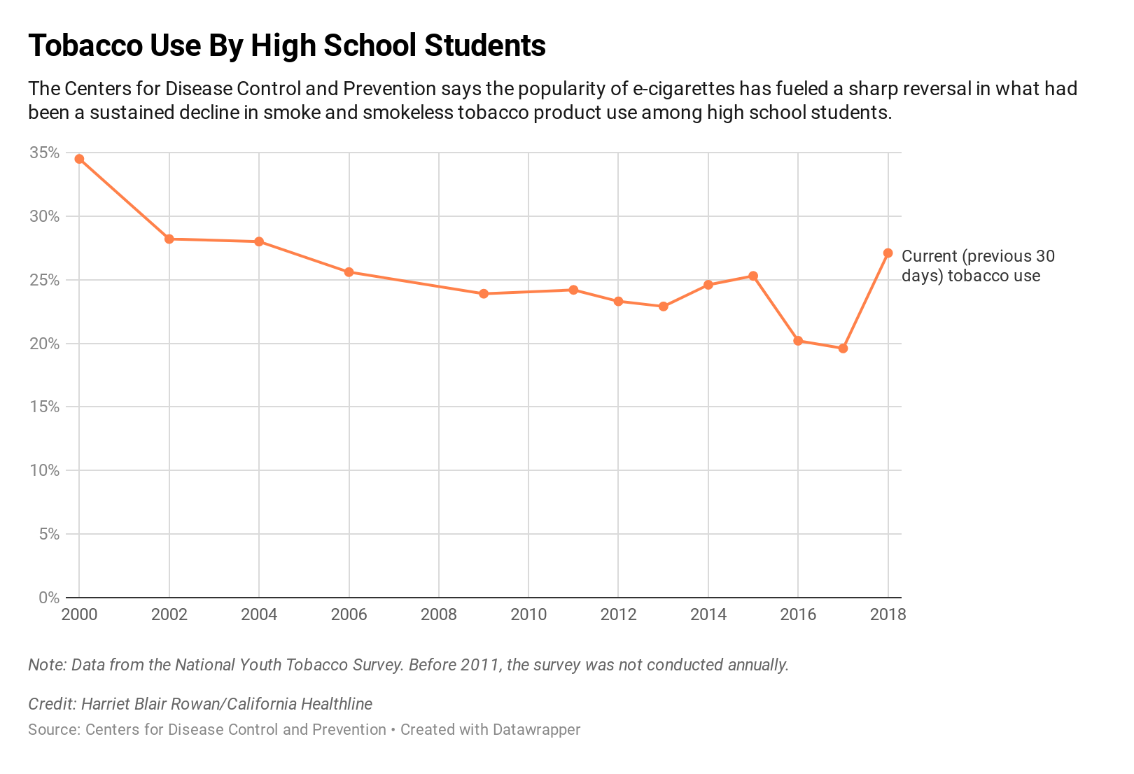 Vaping has surged in the past two years, particularly among teenagers and young adults. More than 20% of high school students reported vaping in 2018 — almost twice the 2017 rate — according to the federal Centers for Disease Control and Prevention. That translates to 3 million high school students using e-cigarettes in 2018 — well more than double the number who reported using traditional cigarettes.