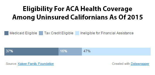 Under the Affordable Care Act’s Medicaid expansion, 37 percent of California’s uninsured were eligible for the program’s assistance. An additional 16 percent were eligible for a tax credit after enrolling.