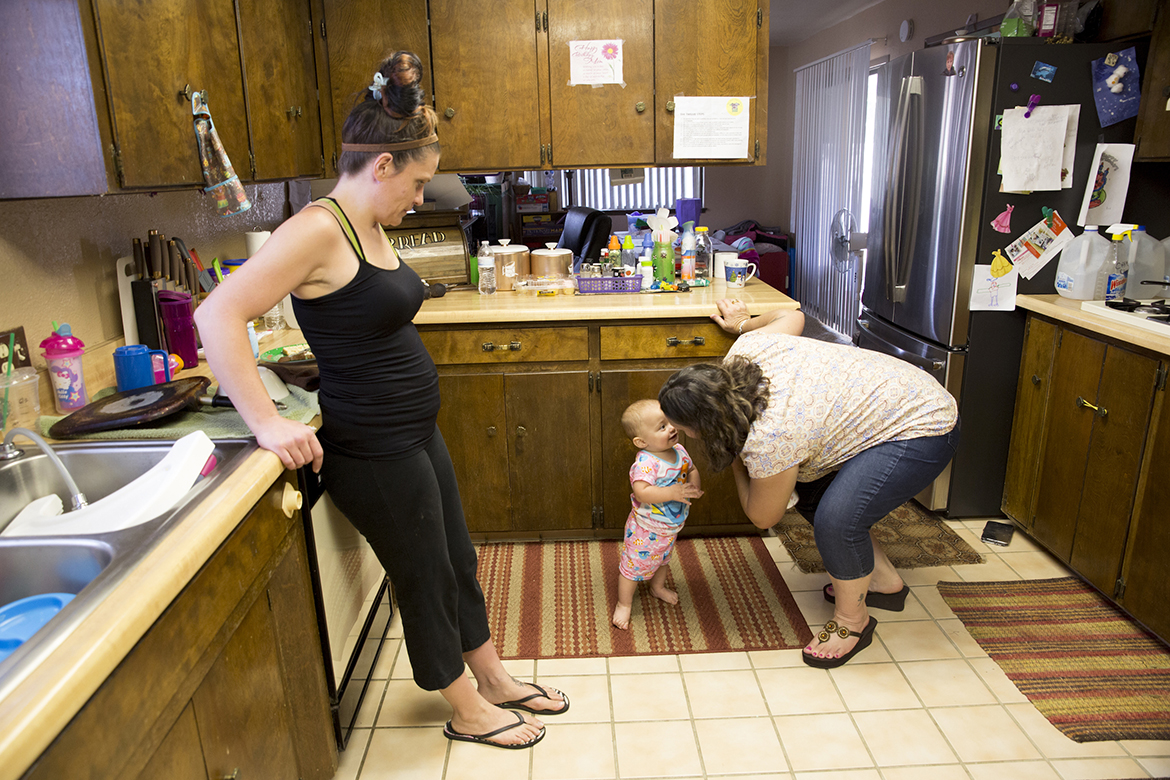 After Heather Menzel takes her methadone prescription on a summer morning in 2016, she goes into the kitchen and watches her daughter, Bella, play with Menzel’s mother, Tawanna Maxwell-Cecil, at their home in Lake Isabella, Calif. (Brian Rinker for KHN)