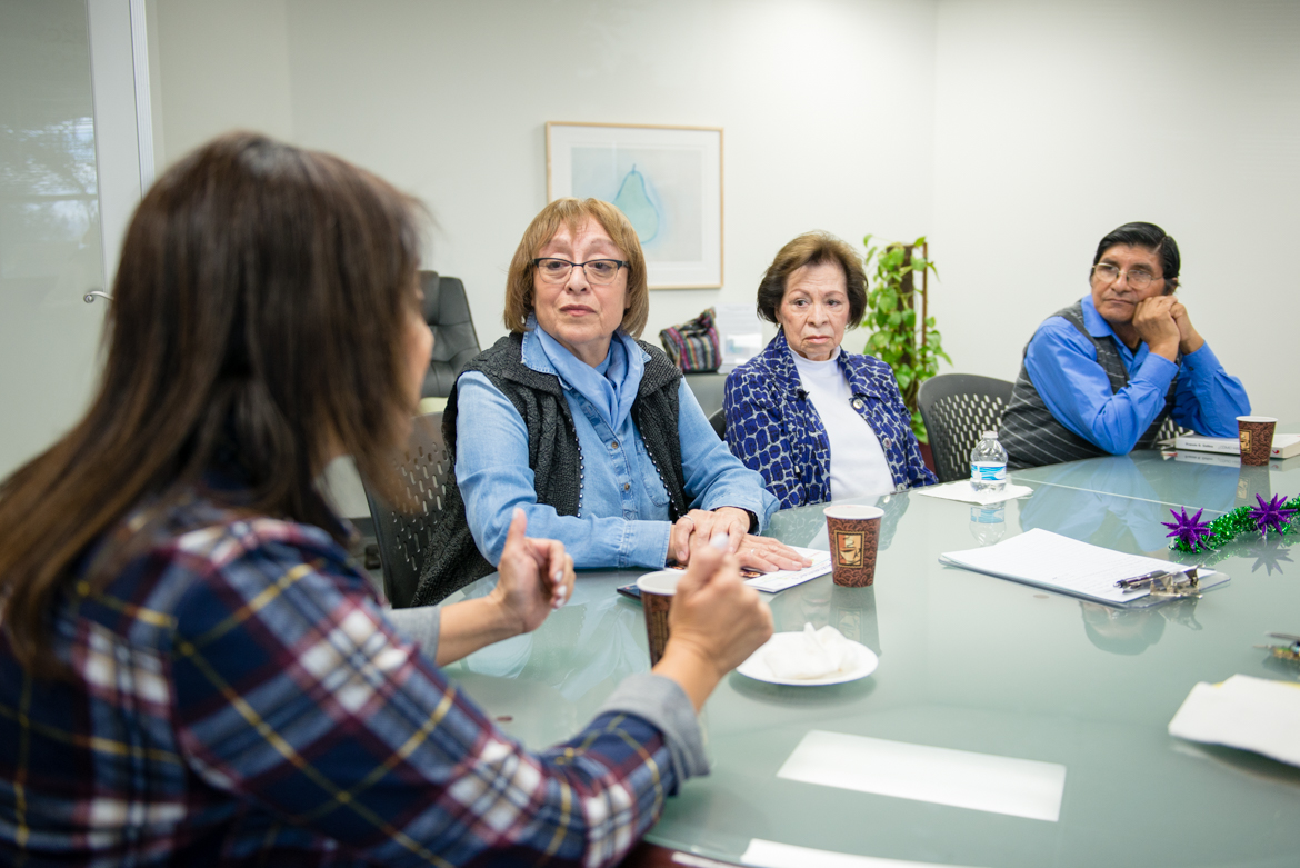 Yanes, left, attends a caregiver support group in Canoga Park, Calif., in November 2016. Yanes says the group has helped her understand how to take better care of her mother who suffers with Alzheimer’s disease. (Heidi de Marco/California Healthline)