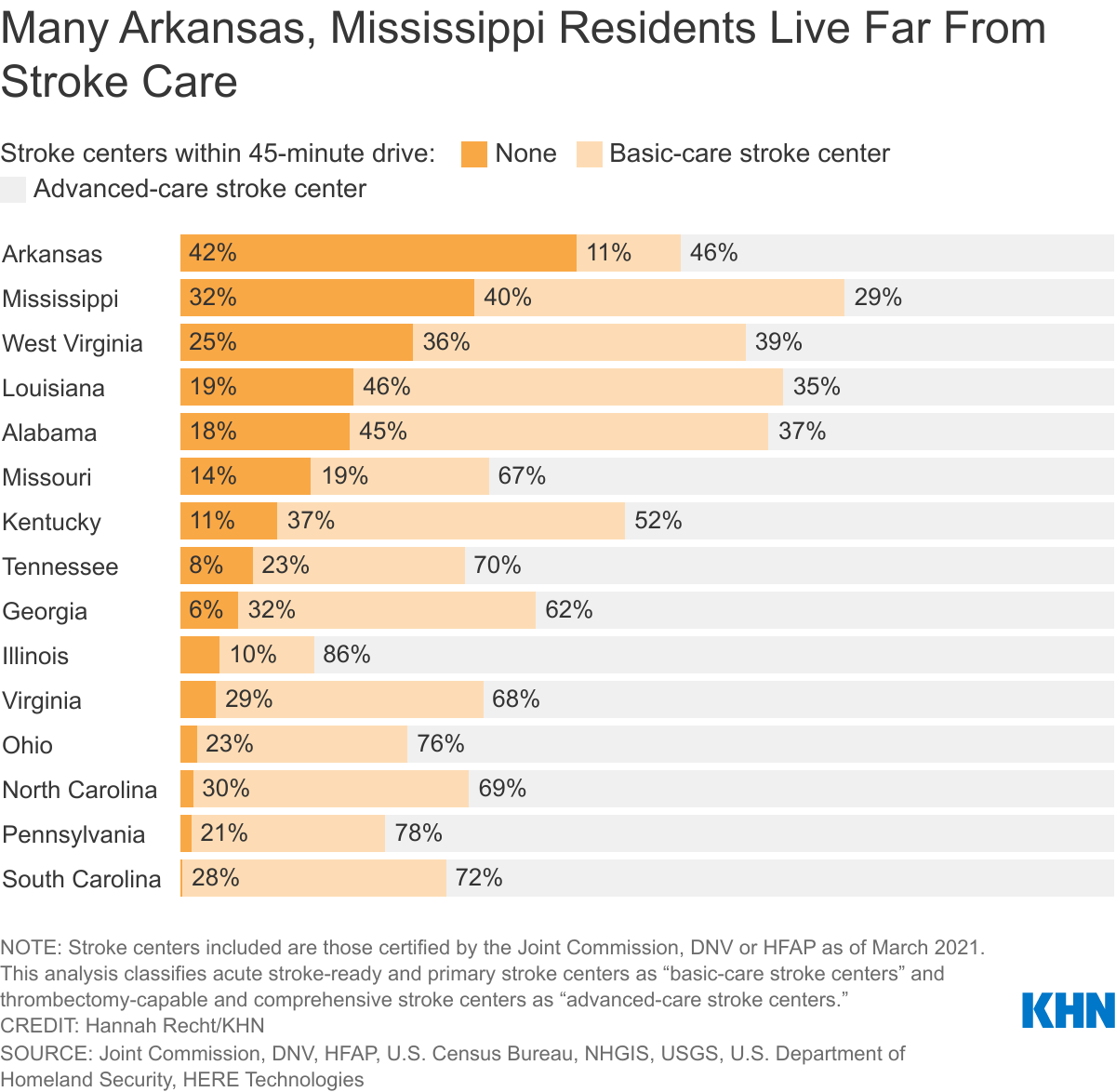 In Tennessee, 2 million people — nearly one-third of the state — are people like Crouch who live more than 45 minutes from a hospital that is stroke-certified and able to provide the most advanced care, according to a new analysis by KHN and InvestigateTV. And rates are even higher in Delta states such as Arkansas and Mississippi, where more than half of residents must drive longer than 45 minutes to those specialized stroke centers.