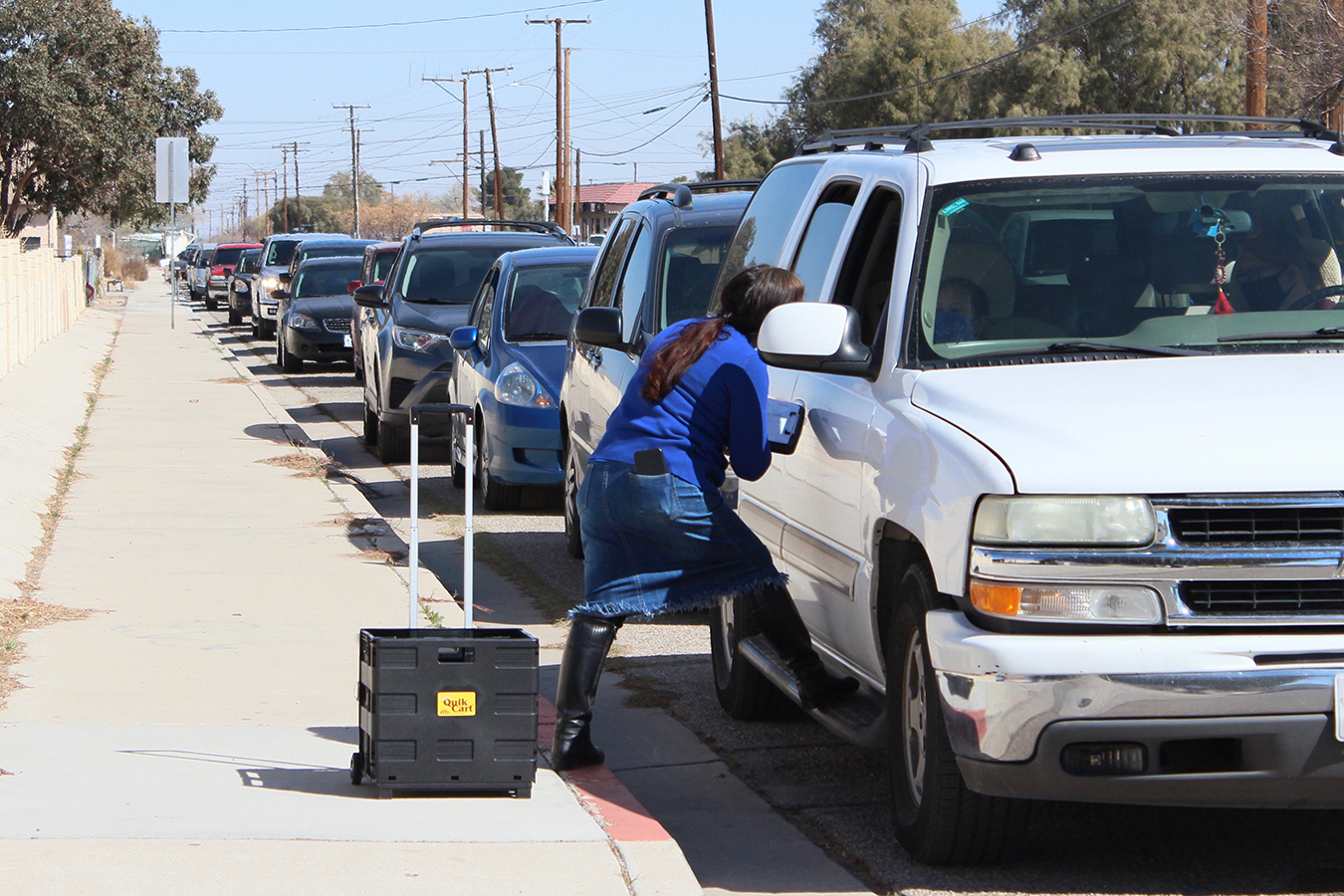 Then it was on to the next car. And the next. As the line started moving, she and fellow health worker Erika Marroquin jogged up and down the sidewalk, taking down names, phone numbers and preexisting conditions. It was the first mild, sunny day the High Desert region had seen in weeks, and the exercise made them sweat.