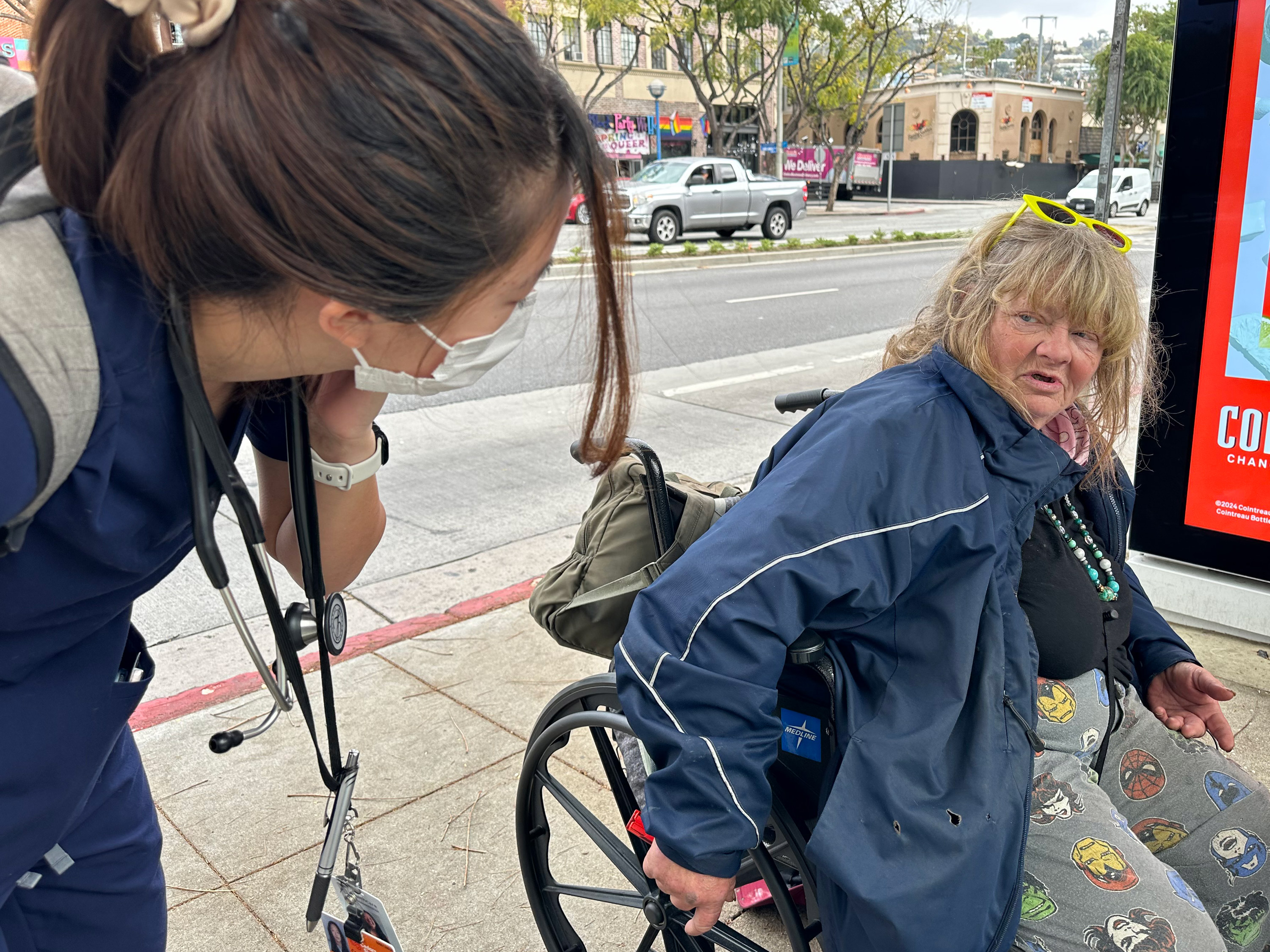 But that’s easier said than done. In West Hollywood that week in April, Healthcare in Action clinical coordinator Isabelle Peng found Lisa Vernon, a homeless woman, slumped over in her wheelchair at a busy bus stop. Vernon is a regular at nearby Cedars-Sinai Medical Center, Peng and her colleague David Wong said.