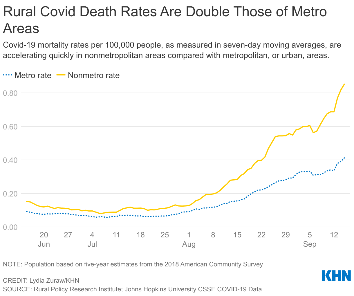 Vaccinations are the most effective way to prevent covid infections from turning deadly. Roughly 41% of rural America was vaccinated as of Sept. 23, compared with about 53% of urban America, according to an analysis by The Daily Yonder, a newsroom covering rural America. Limited supplies and low access made shots hard to get in the far-flung regions at first, but officials and academics now blame vaccine hesitancy, misinformation and politics for the low vaccination rates.