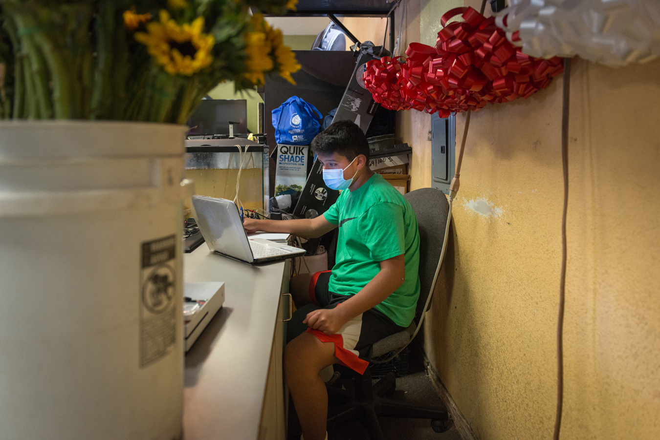 EAST LOS ANGELES — For the past year, 13-year-old twins Ariel Jr. and Abraham Osorio have logged on to their online classes from their parents’ flower shop. Ariel nestles in a corner among flowers, bows and stuffed animals. Abraham sets up on a small table in the back, where his dad used to work trimming flowers and keeping the books.
