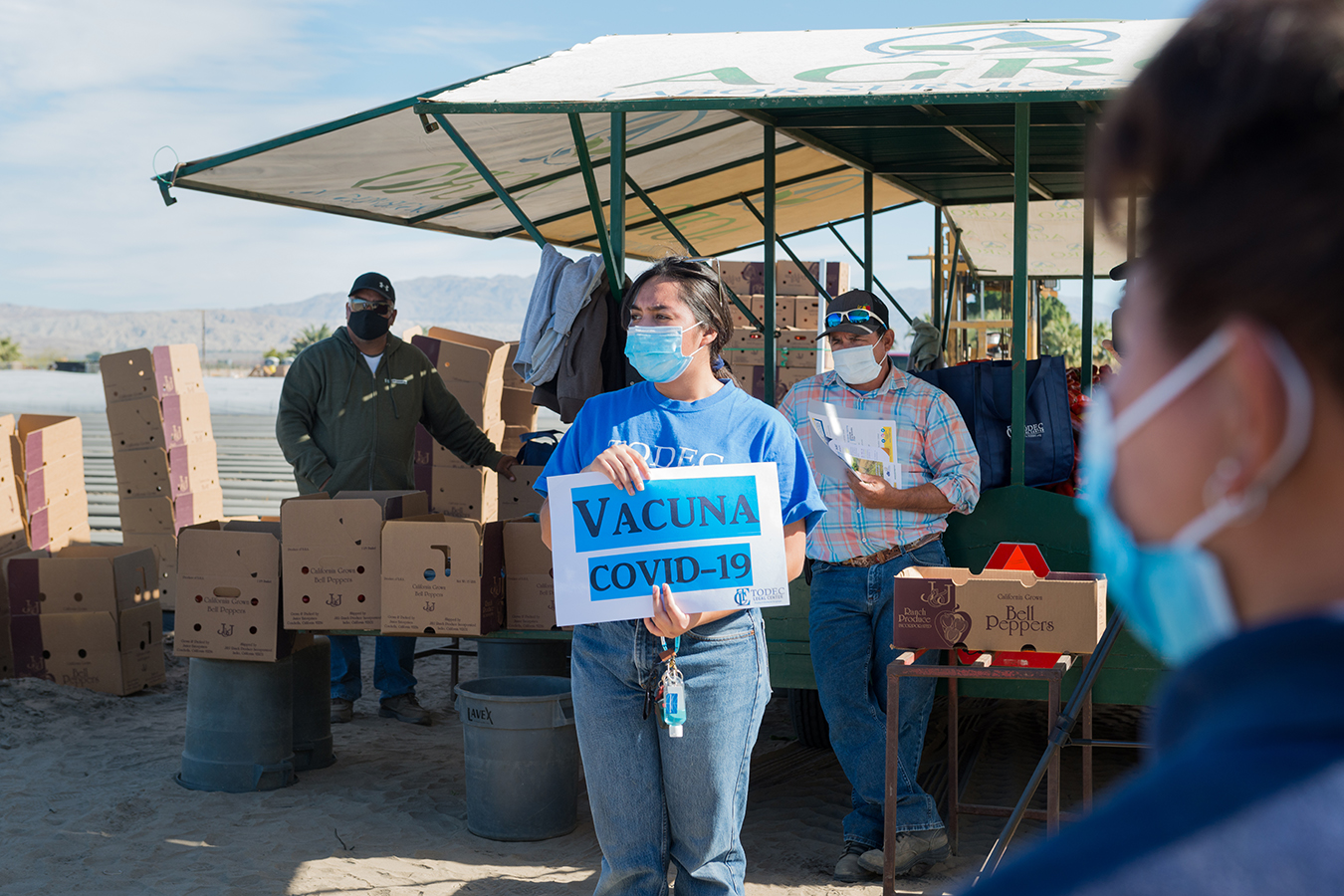 She just got the first dose of vaccine herself, a detail she shared with the farmworkers gathered around her. “I didn’t get any side effects, but some say it feels like a bruise on your arm,” she told them in Spanish.