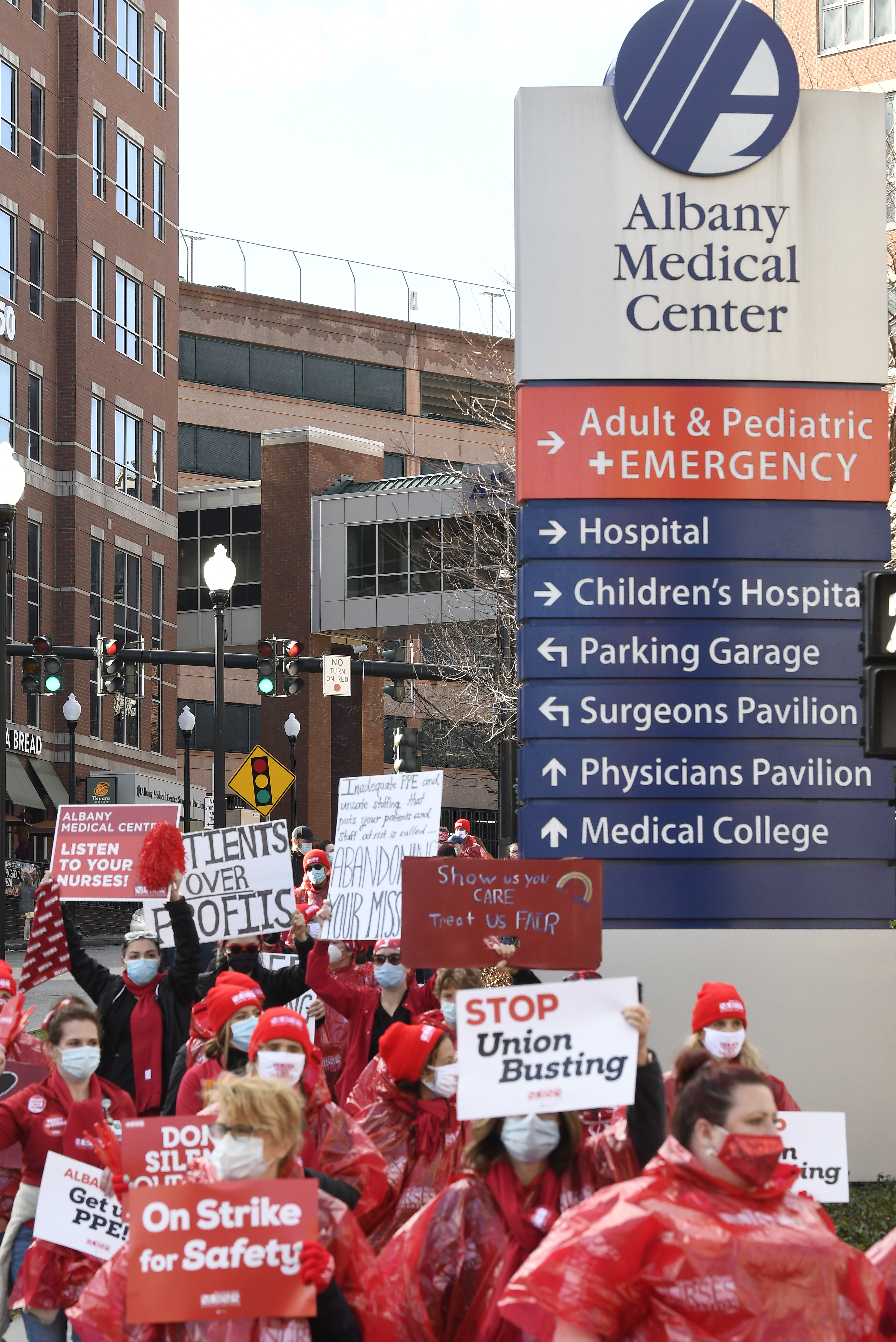 Nurses at Albany Medical Center in New York picketed on Dec. 1 with signs demanding PPE and spoke about having to reuse N95 masks up to 20 times.