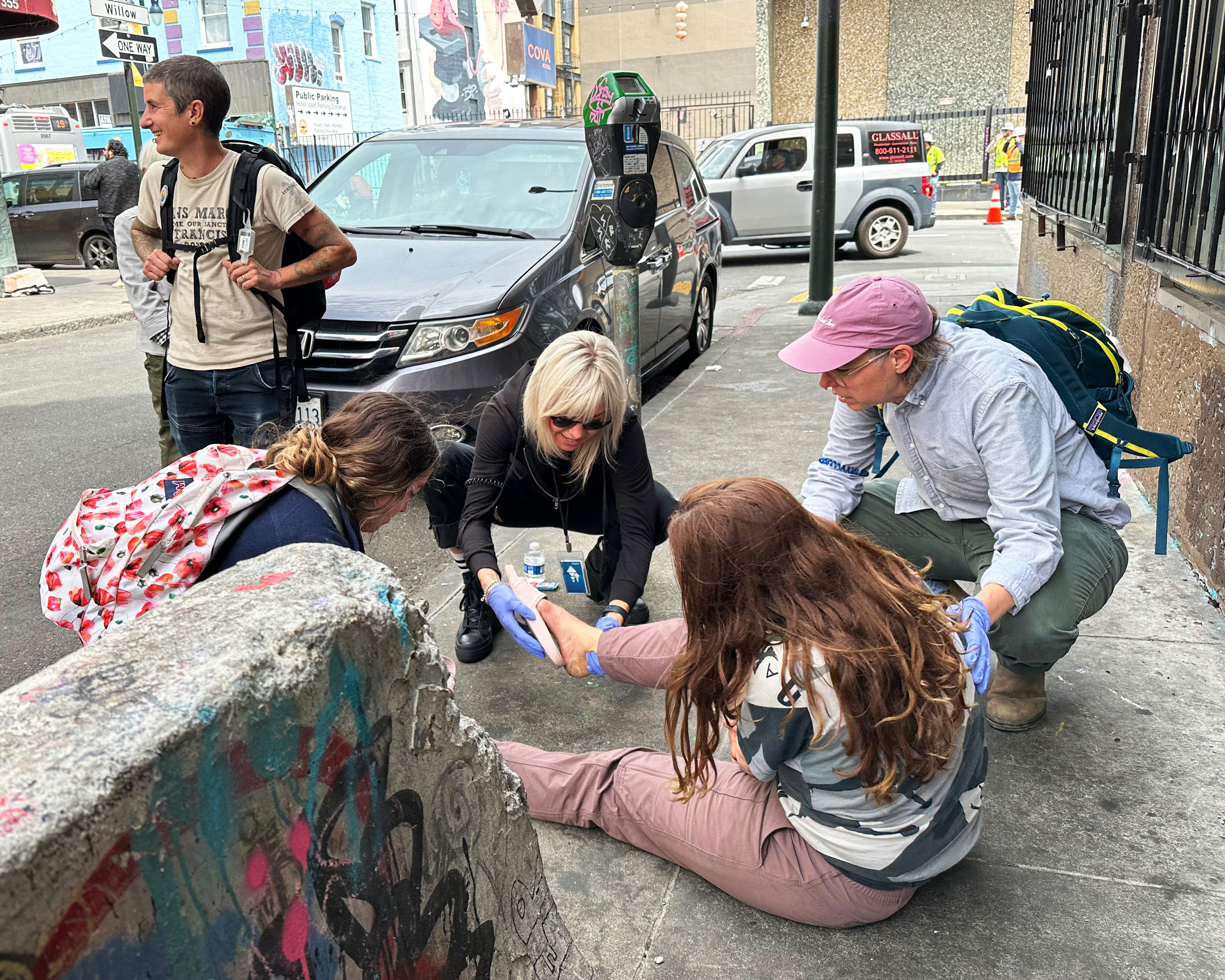 Taylor Cuffaro, a nurse practitioner and street medicine provider with the San Francisco Community Health Center, trudged the streets of the Tenderloin with Eli Benway, a licensed clinical social worker who provides talk therapy and other behavioral health treatment on the street, searching for patients on a bright August afternoon.