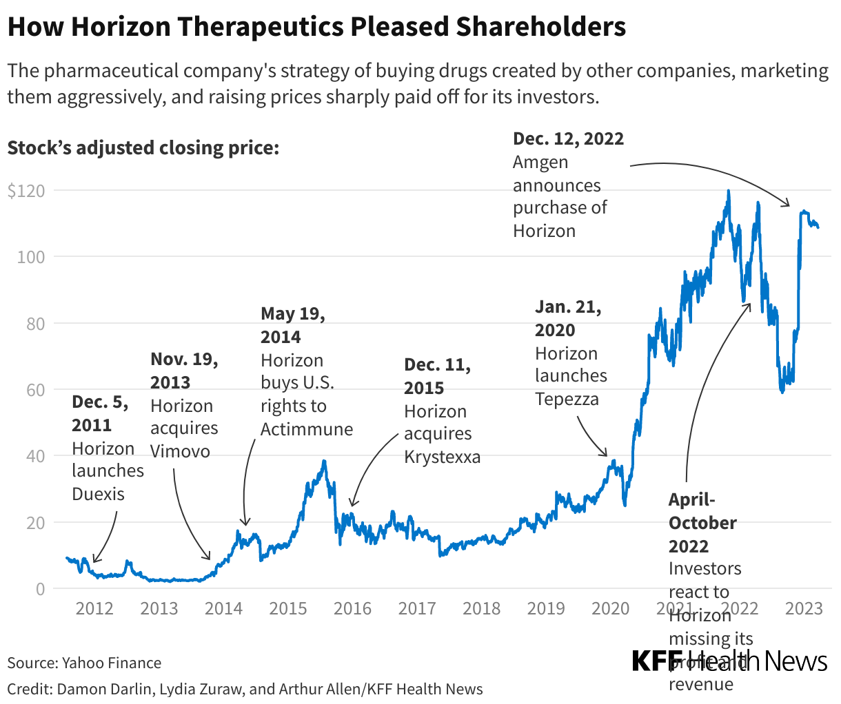 Horizon’s strategy has paid off handsomely. Krystexxa was just one of the many shiny objects that attracted Amgen, a pharmaceutical giant. Amgen announced in December that it intends to buy Horizon for $27.8 billion, in the biggest pharmaceutical industry deal announced in 2022.