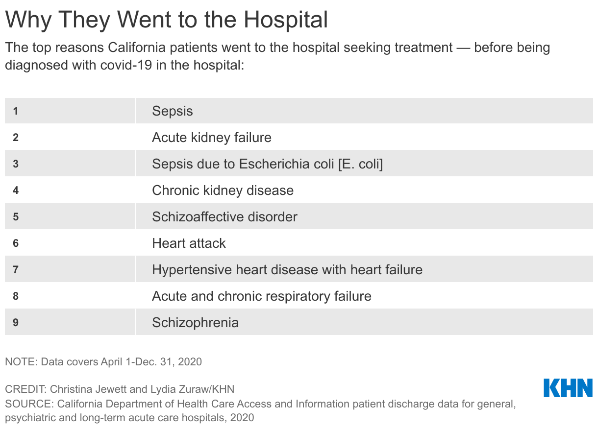 In California alone, nearly 2,200 patients were diagnosed with covid after seeking care for conditions from sepsis to schizophrenia, based on an analysis for KHN by the California Department of Health Care Access and Information.