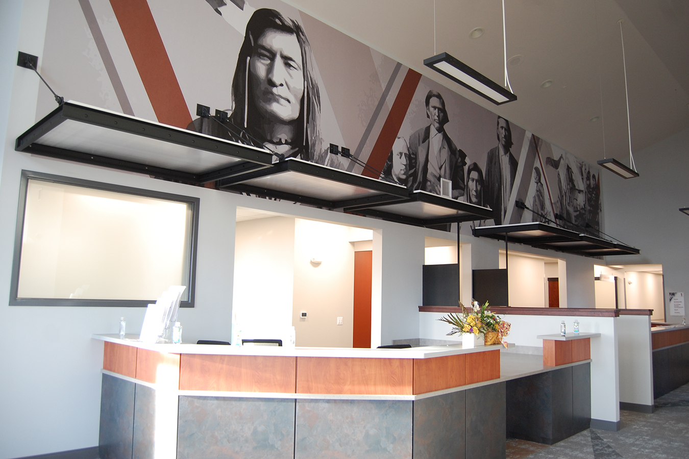 On a recent day, Wendland smiled as she pointed to the word boozhoo on the clinic’s entrance, welcoming people with the word in the Ojibwe language that means “greetings.” Inside, above the reception desk, is a massive image of Ayabe-Way-We-Tung, also known as Chief Little Shell III, who began pushing the U.S. government for a reservation in 1872. Historical photos of Little Shell people are displayed nearby. Lines of gray and burnt orange take the shape of abstract tepees along the clinic’s walls and floors.