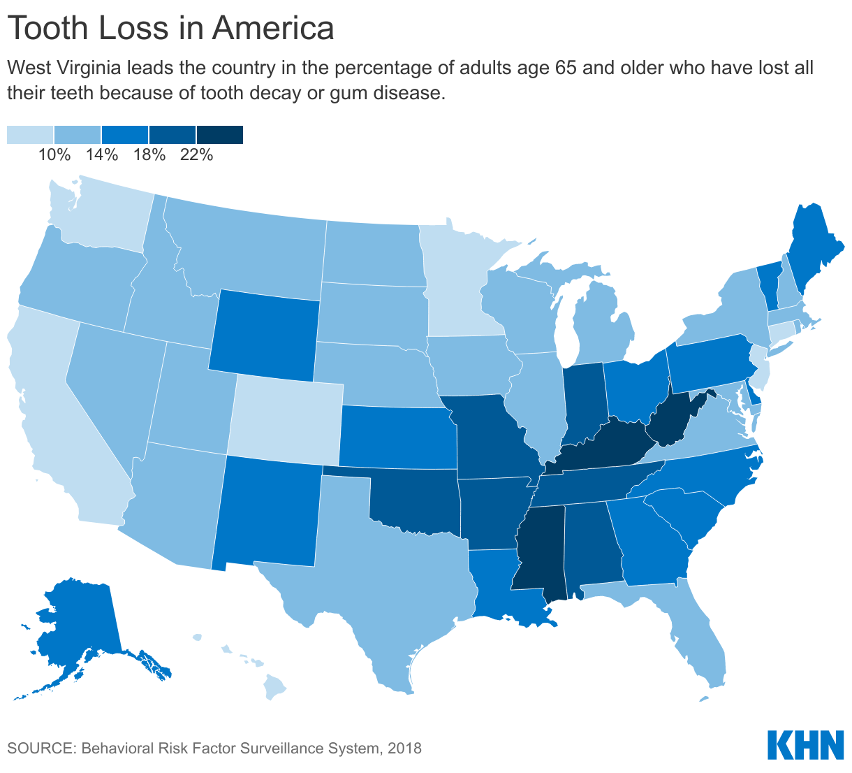 Marchio believes that losing her teeth was merely part of getting older. It’s quite common in West Virginia, where a quarter of people 65 and older have no natural teeth, the highest rate of any state in the country, according to federal data.