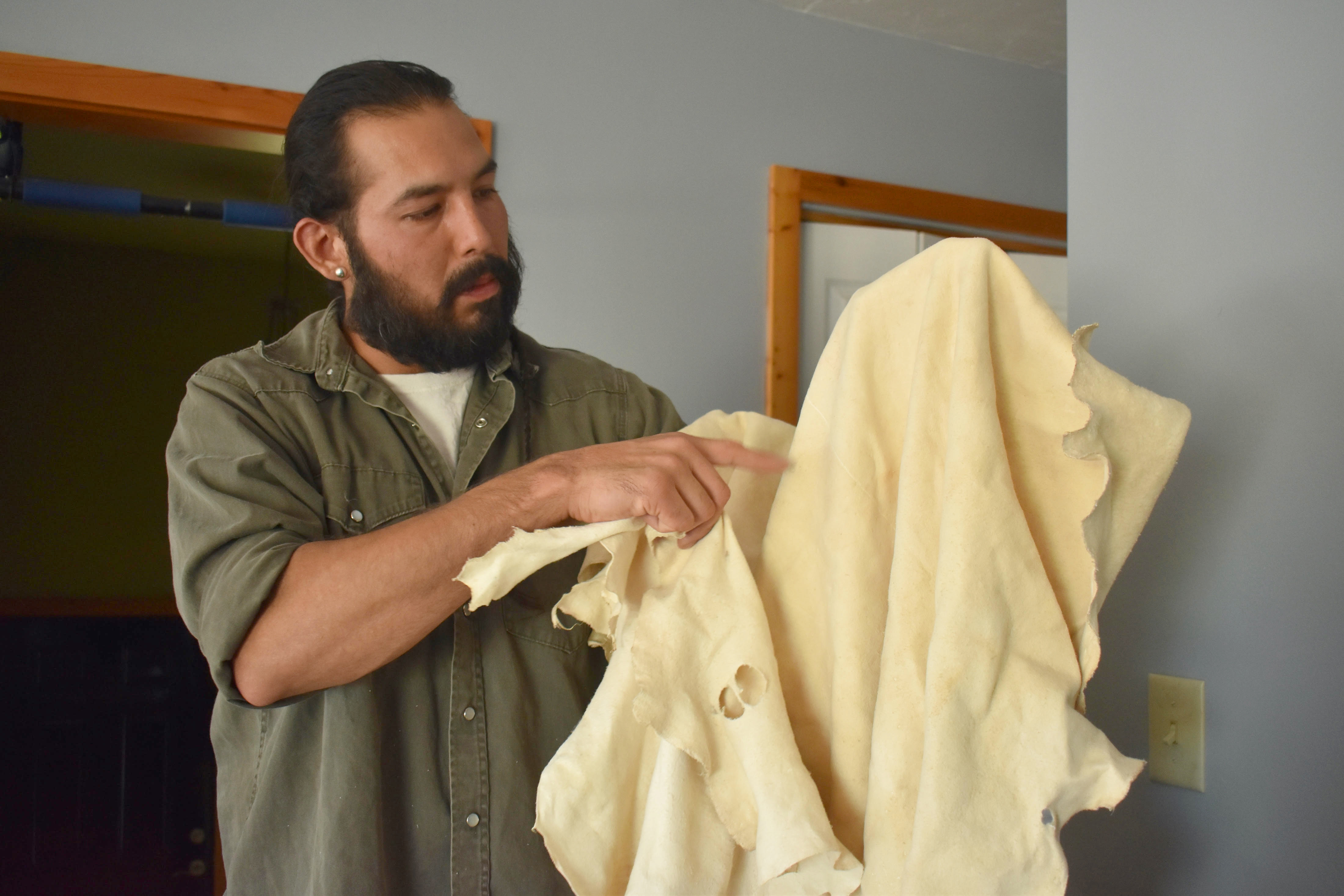 Cook uses the hides he tans to make drums, moccasins, and tribal regalia. Typically, Indigenous people like Cook use the brains of animals they hunt to tan the hides. But Cook has switched to pig brains for all his tanning, in part because of chronic wasting disease, which afflicts deer, elk, and moose.