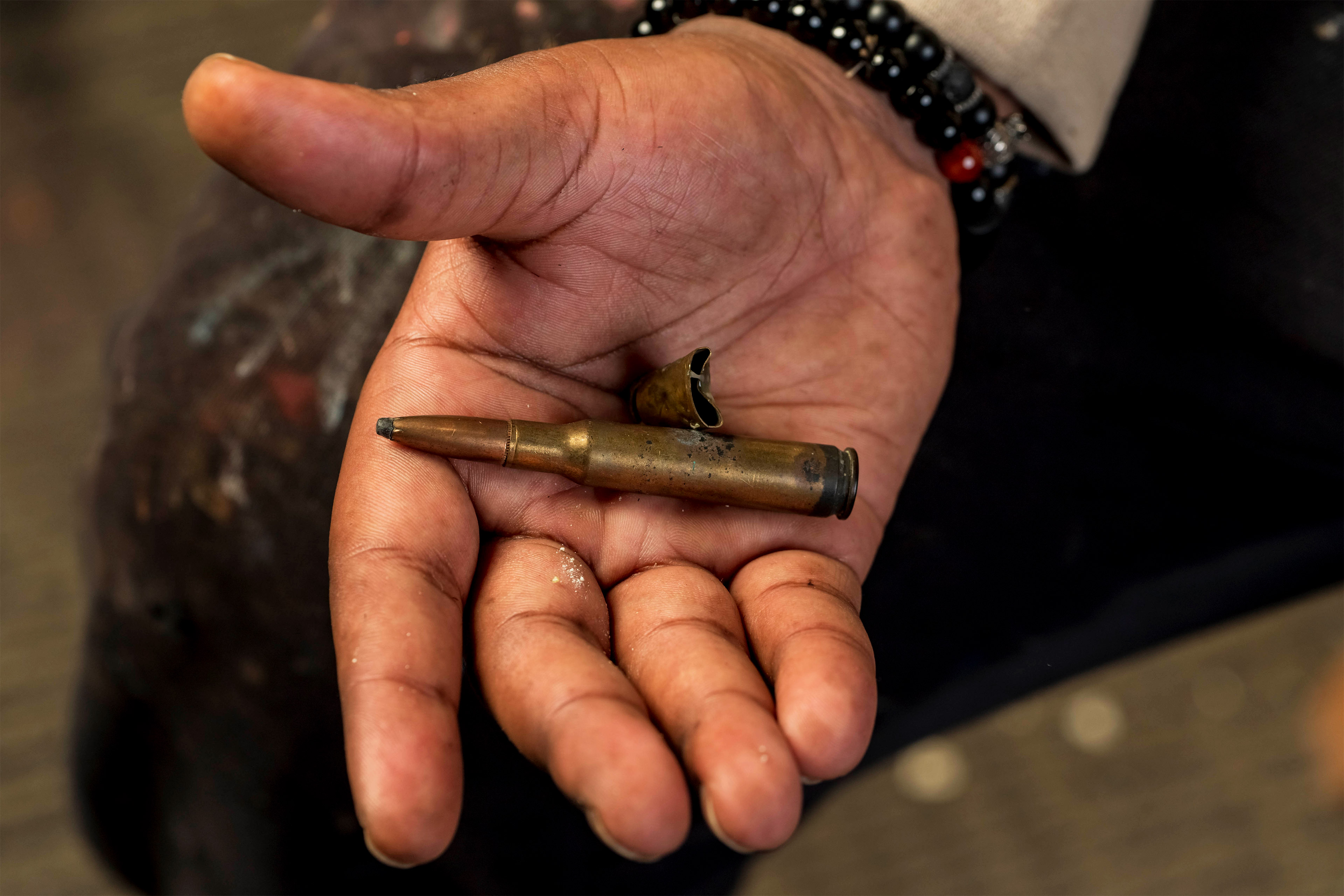 En el estudio de Ash, municiones usadas se mezclan con llantas trituradas, vidrios rotos y pintura para transformar la basura de la violencia en arte que cuenta historias sobre la raza, la resistencia y la historia. El trabajo es personal, dijo Ash.