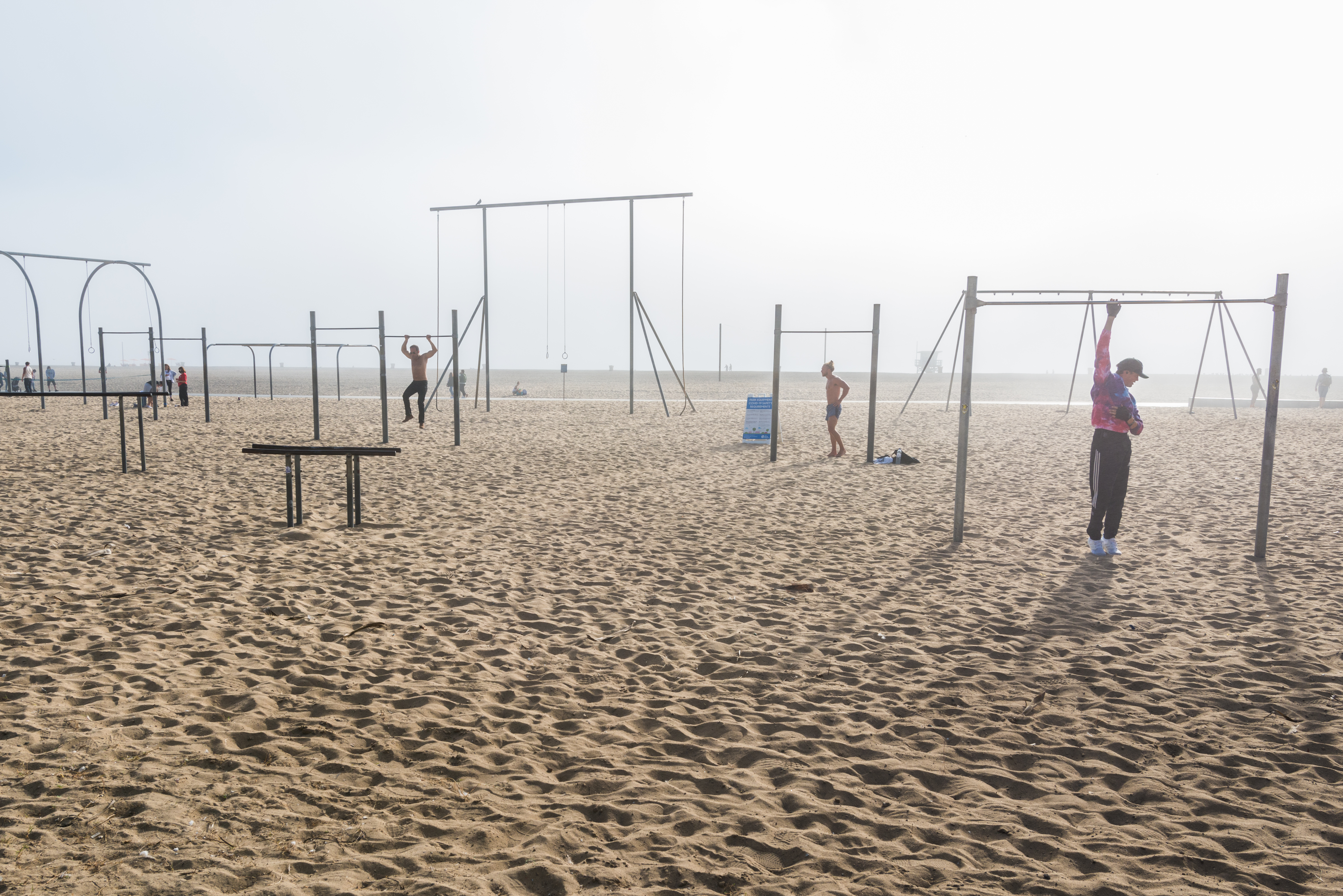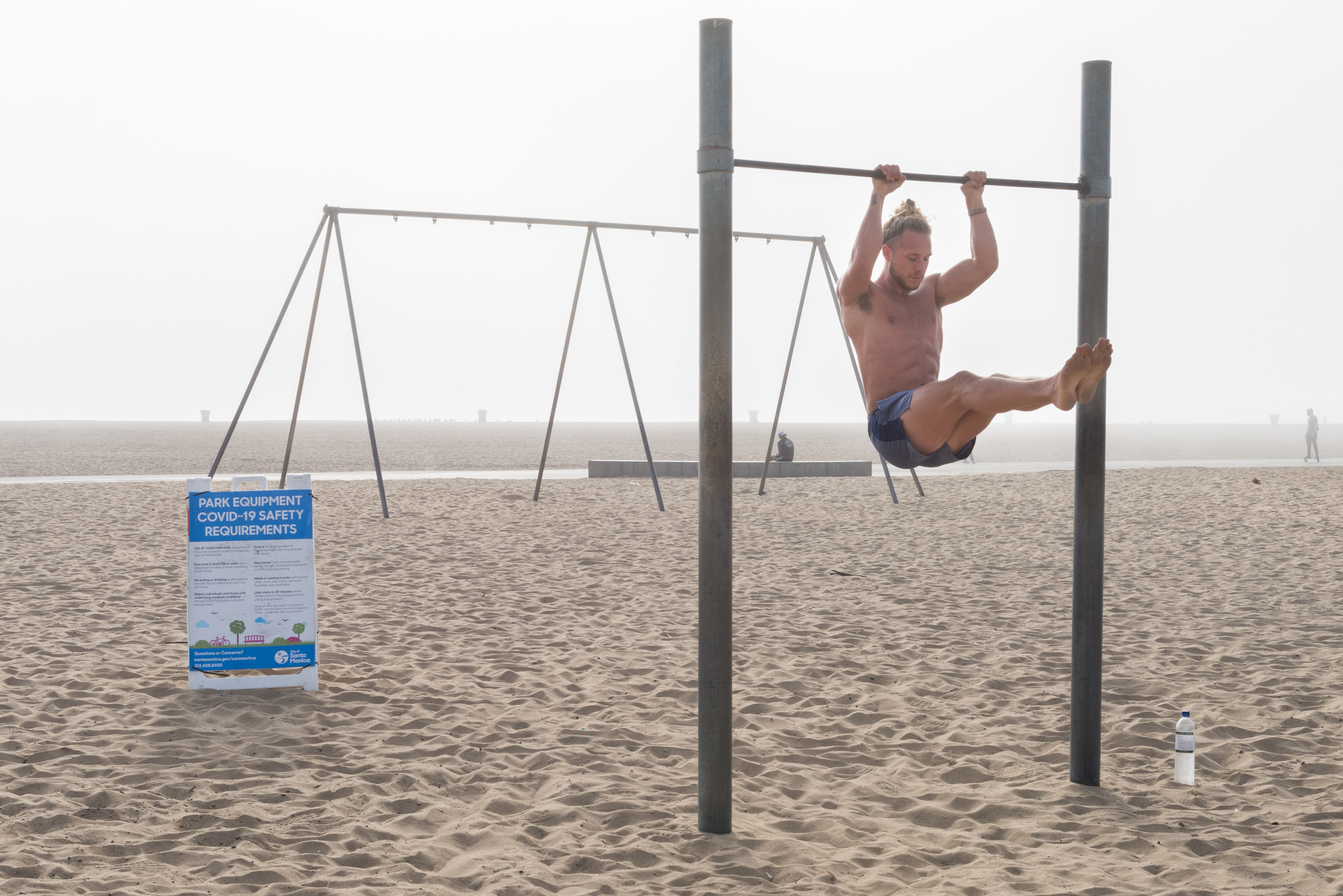 November 2020: The city of Santa Monica has closed its famous pier to cars. (Heidi de Marco/California Healthline)November 2020: People are allowed to walk onto the pier as long as they wear a face covering.(Heidi de Marco/California Healthline)November 2020: Despite the haze, a handful of people work out at Muscle Beach in Santa Monica on Tuesday afternoon. (Heidi de Marco/California Healthline)November 2020: Beachgoers said they didn’t feel the need to wear a mask since they were outside, and because wearing a mask makes it harder to breathe while working out.(Heidi de Marco/California Healthline)