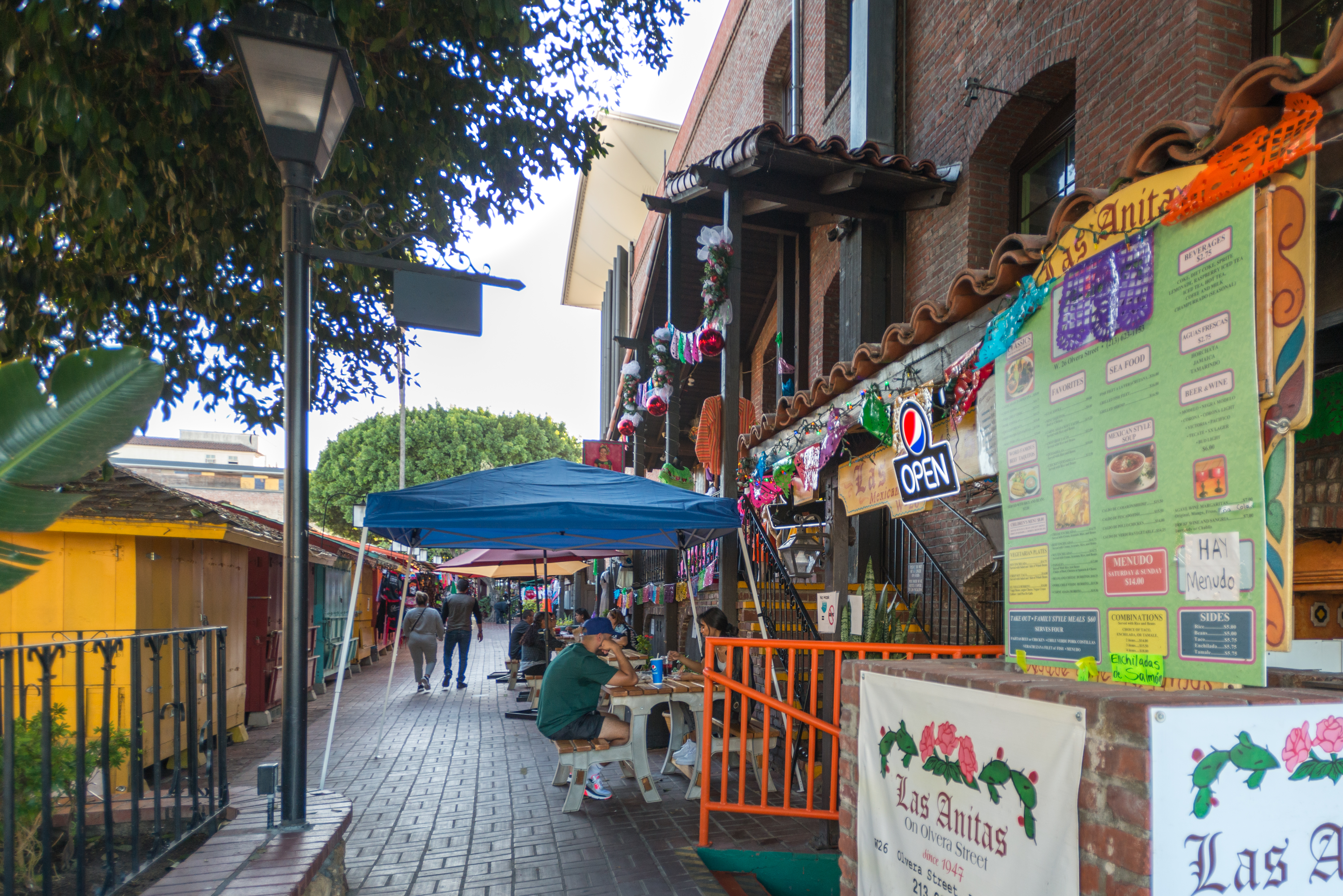 November 2020: Some shops on Olvera Street remain closed, but most restaurants are open and offer outside seating for customers. (Heidi de Marco/California Healthline)
