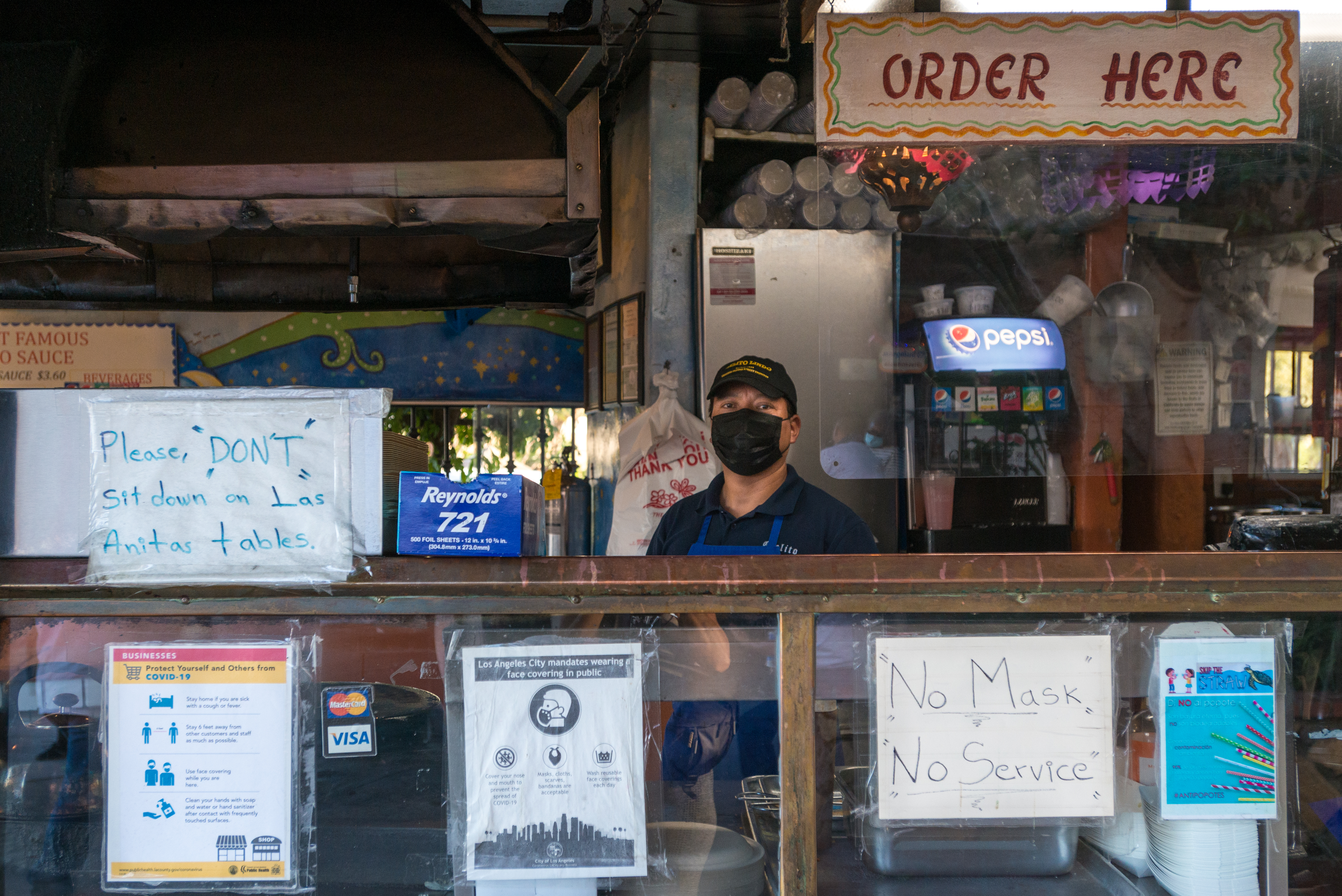 November 2020: Gaytan now wears a mask while working and stands behind a plexiglass barrier when taking orders. The restaurant has remained open during the pandemic, he said, and business is steady. He said he has had to deal with only a few customers who didn’t want to wear a mask. (Heidi de Marco/California Healthline)