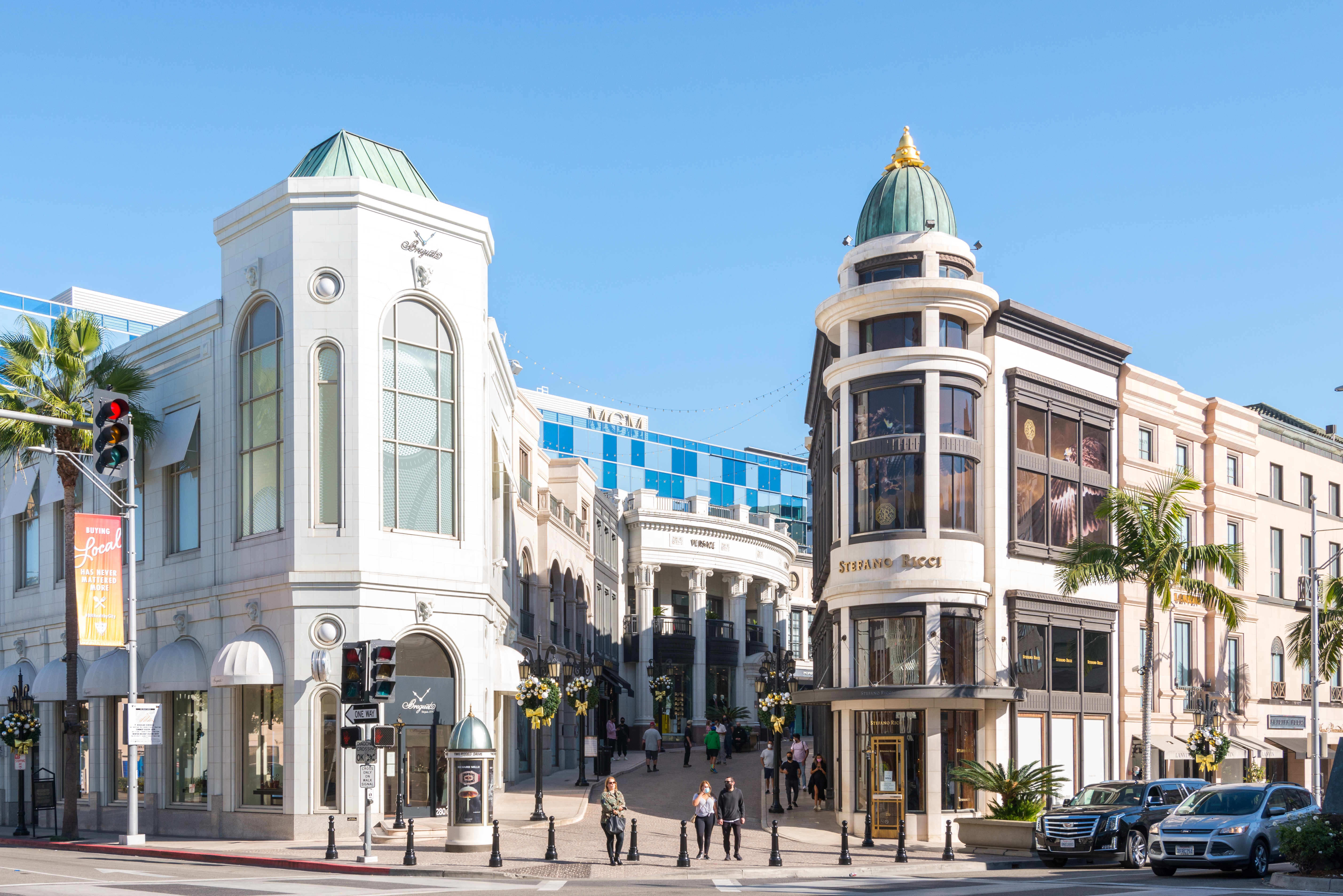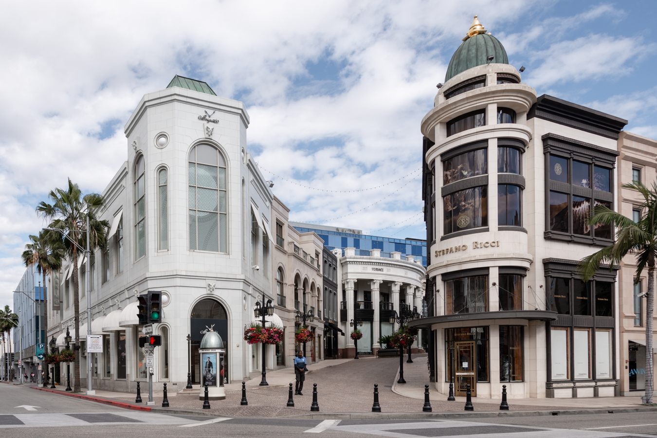 November 2020: People wander through the Rodeo Drive Walk of Style in Beverly Hills, which is again open to the public. Most people wore masks as they visited the stores that were open. (Heidi de Marco/California Healthline)