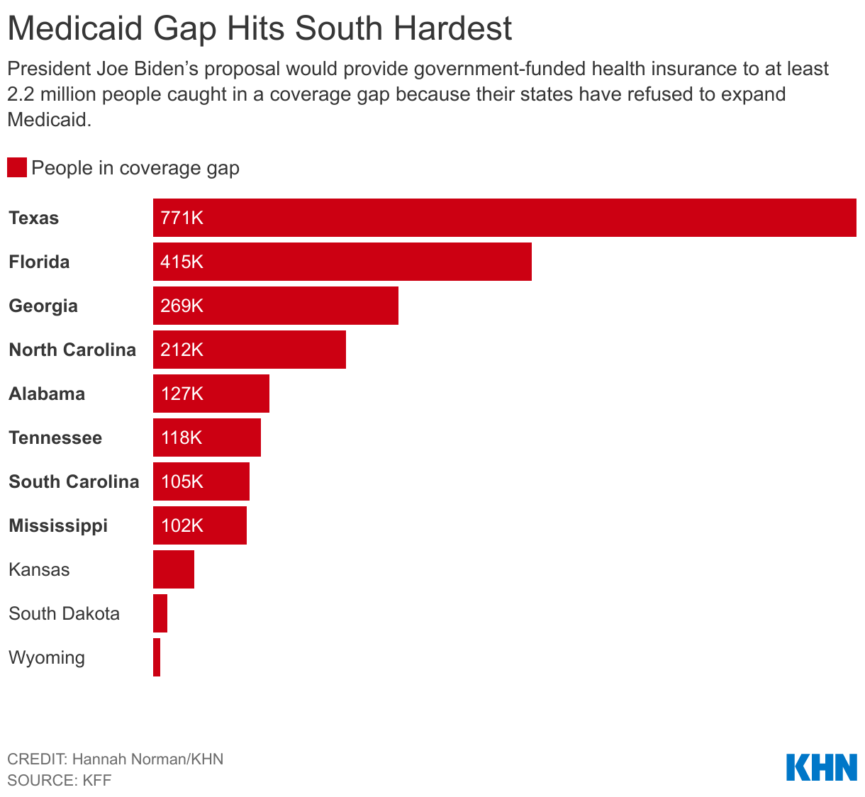 An estimated 60% of those caught in that Medicaid coverage gap are Black or Hispanic, according to the Center on Budget and Policy Priorities. And nearly two-thirds of those in the gap live in one of three Republican-controlled states: Texas (771,000), Florida (415,000) and Georgia (269,000), according to a KFF analysis.