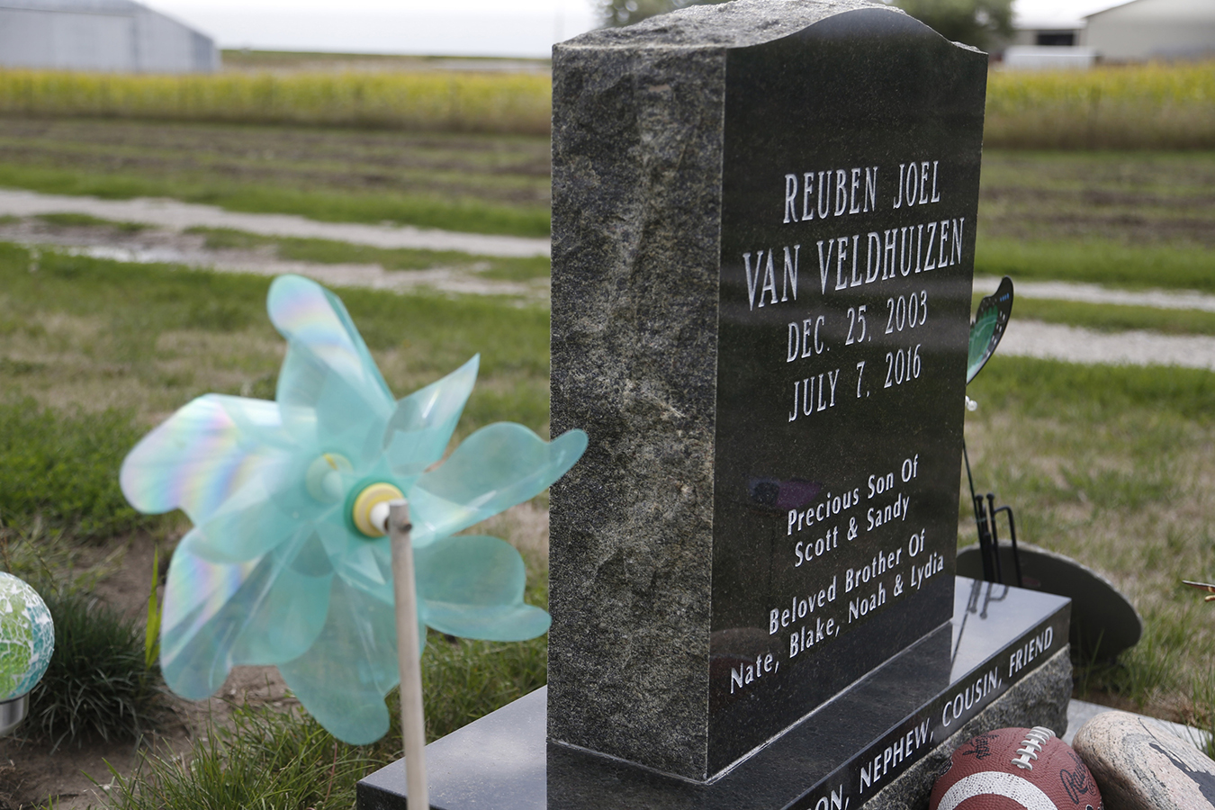 A football and a pinwheel are among the decorations on Reuben's grave at Evergreen Cemetery in Leighton, Iowa. (Michael Zamora/The Des Moines Register)