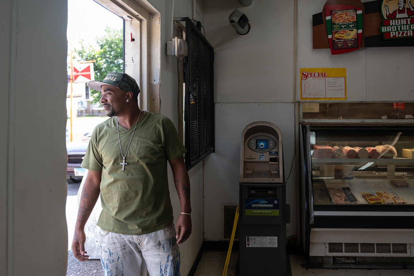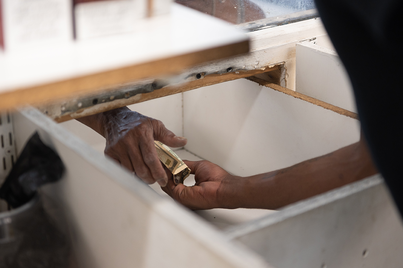 At Chalie’s Convenient Market, the windows between the store owners and customers have bullet holes in them. Customers use one of the holes to slide in change under a handwritten sign, “Tip the Cook.” (Michael B. Thomas for KHN)