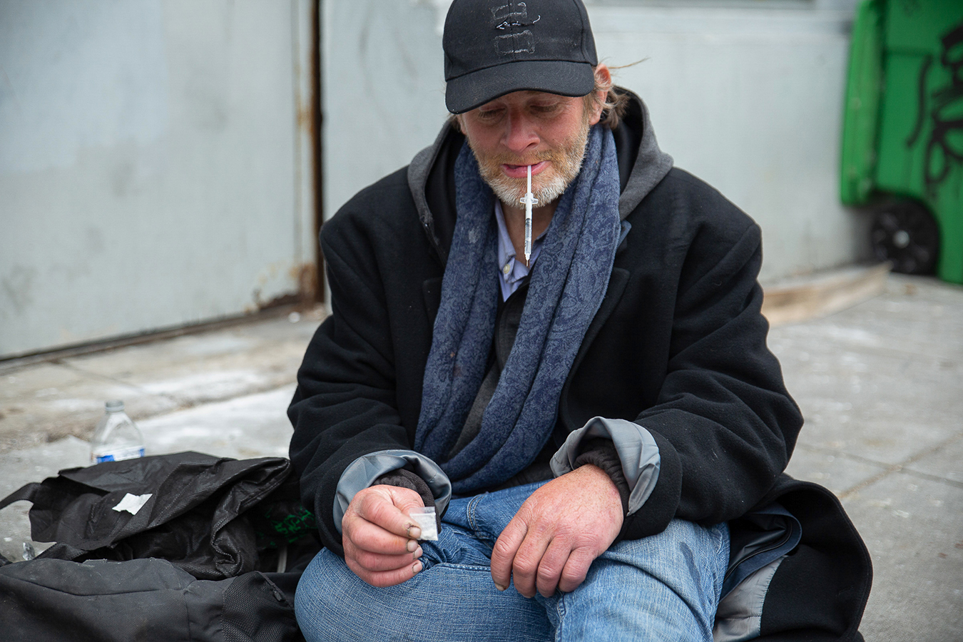 One recent May afternoon near Market Street, a thin man in his early 40s who called himself Bud slid a needle into his arm and slowly pushed the plunger down, stopping every so often to gauge the effects of the fentanyl.