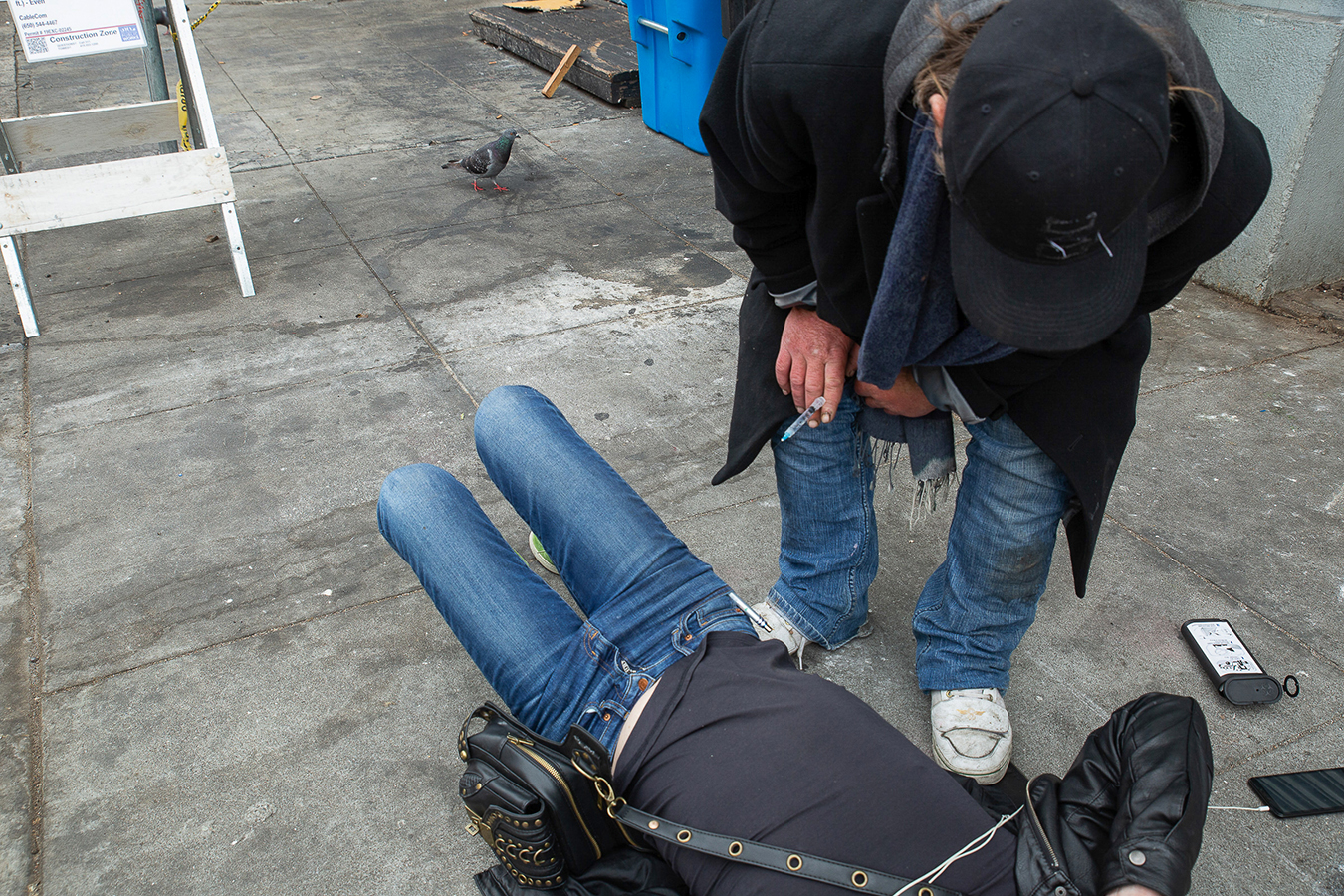 The man was out of his wheelchair and lay flat on his back just off San Francisco’s Market Street, waiting for the hypodermic needle to pierce his skin and that familiar euphoric feeling to wash over him.