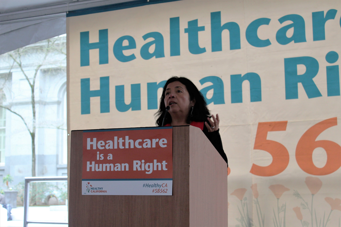 Castillo, the first speaker, set a defiant tone for the raucous event, which took place just before an informational hearing on the bill that would replace private insurance with one government-administered or “single-payer” health care system in California.
