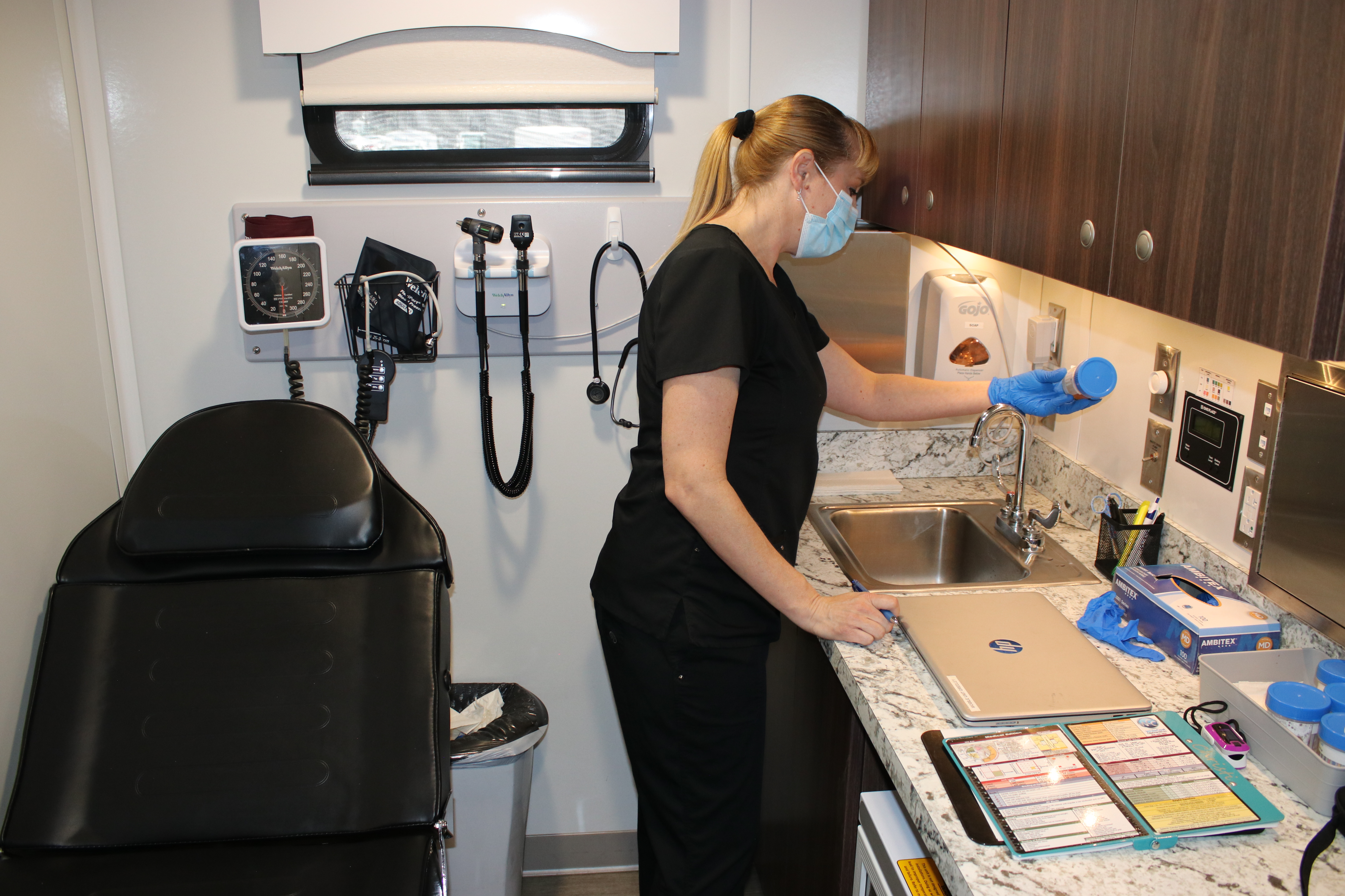 After patients check in, they go to the RV’s snug bathroom to provide a urine sample. With test strips built into the sides of the cup, results show instantly whether any of 13 categories of drugs — from opiates to antidepressants — are in the urine. The sample is later dropped off at a lab to confirm the results and determine which specific drug is involved. The results help the team understand how best to treat the patients and make sure they use the prescriptions they’re given.