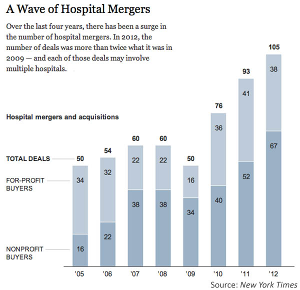 But there’s been a marked uptick in hospital M&A since Obamacare’s passage, with total mergers rising from 50 deals in 2009 to more than 100 in 2012.