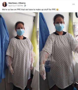 Sherry Martinez, a certified nursing assistant in Salinas, California, has purchased her own N95 masks, boot covers and a raincoat to serve as personal protective equipment, or PPE, on the job. She doesn’t blame managers for not being able to secure the proper supplies during the pandemic but says that her willingness to care for future COVID-19 patients depends on whether or not the staff has enough PPE. (Photo courtesy of Sherry Martinez)
