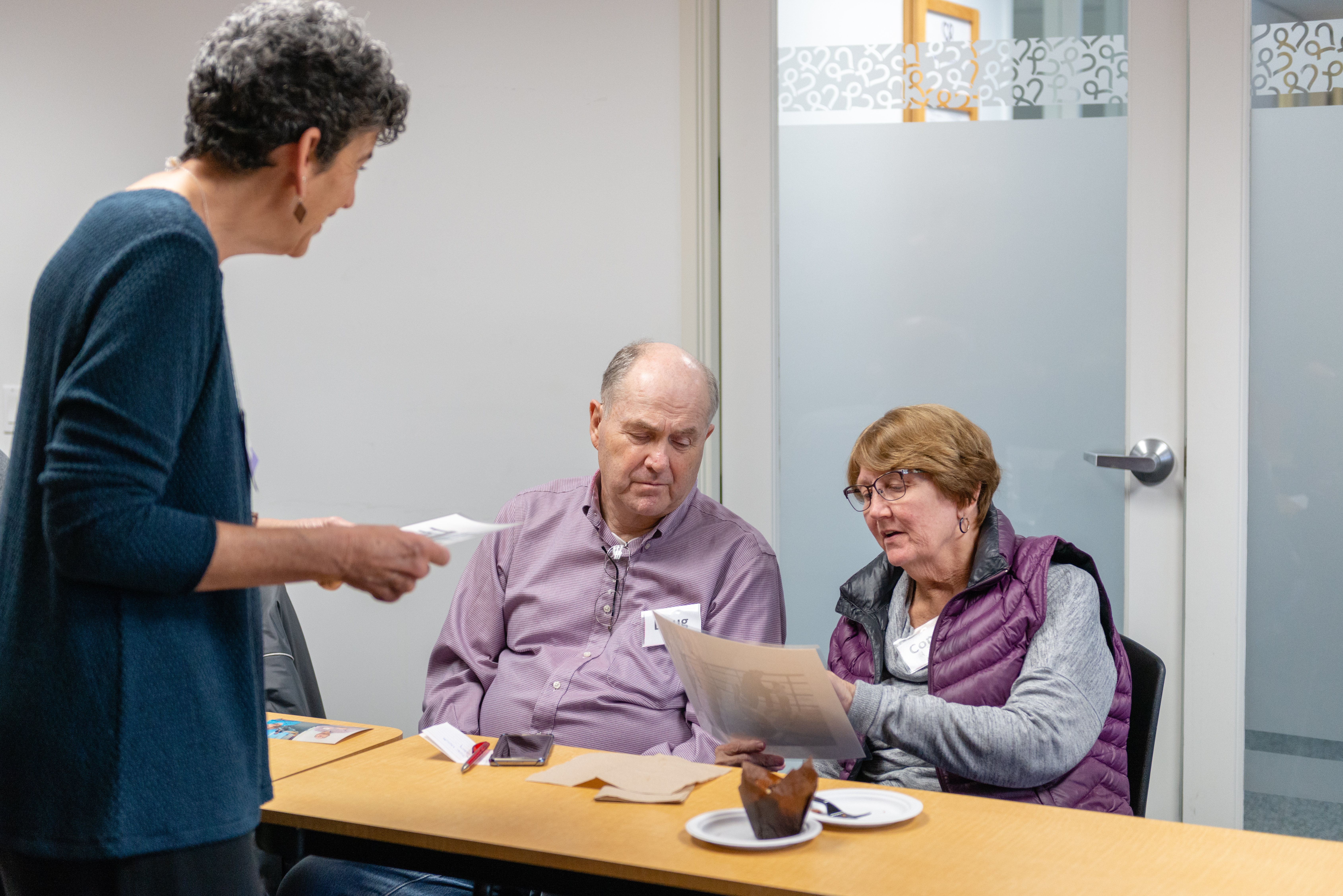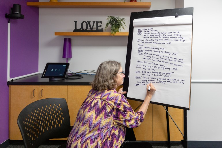 Linda Goldfinger, the facilitator of Memory Mornings, writes down the group’s descriptions of what is happening in the photograph. At the end of the exercise, she compiles the responses into a story, types it up and gives a copy to each participant.(Heidi de Marco/California Healthline)
