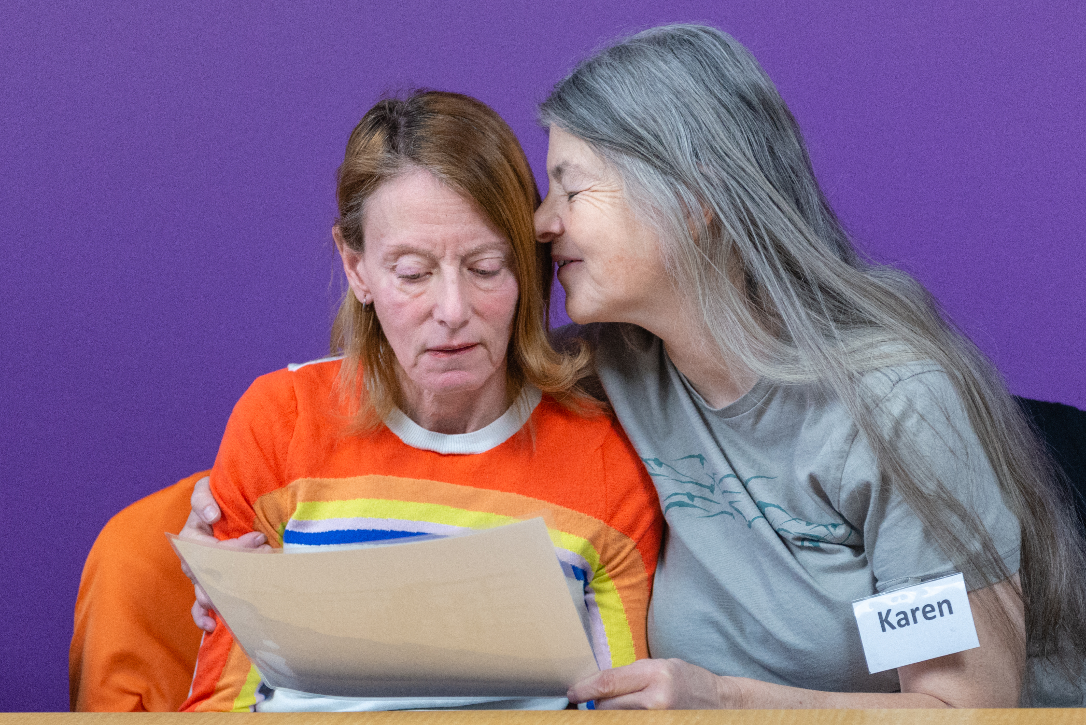 Karen Pearson and her partner, Ilene Barg, work on formulating a description of the photograph. Karen is Ilene’s caregiver and a regular participant in the program. “The connections being made are so valuable,” Pearson says. “No matter what the content, we always walk away with a good feeling.”(Heidi de Marco/California Healthline)