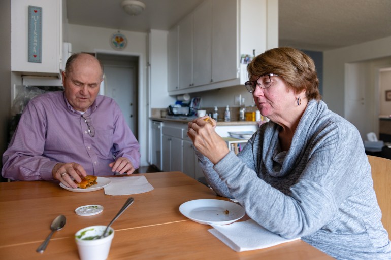 Doug prepares lunch for Connie after returning from the meeting. Connie says she’s hungry, but she doesn’t say much else. "I try to talk to her," Doug says. "But you can’t have a dialogue with her."(Heidi de Marco/California Healthline)