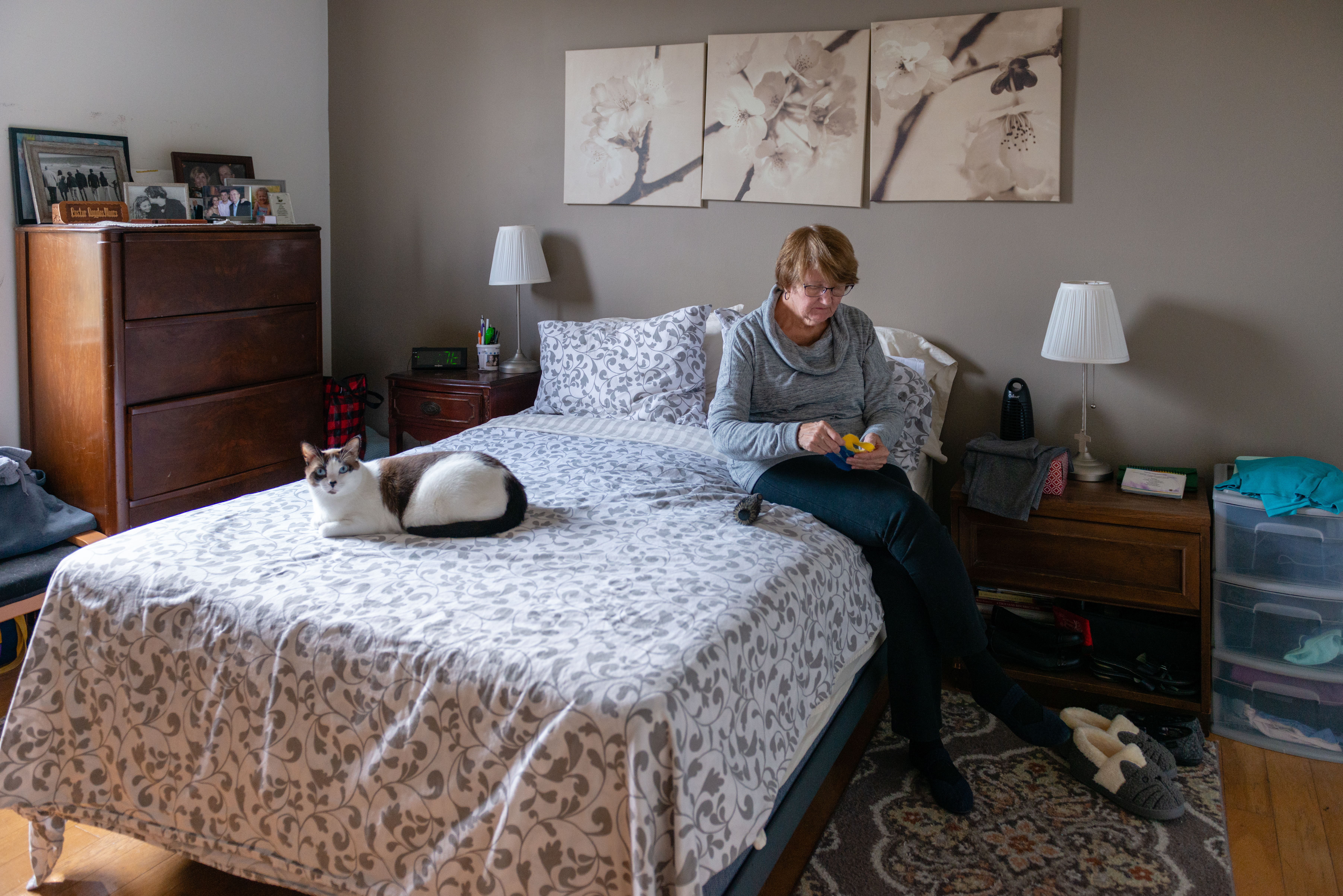 Connie keeps herself busy for hours fiddling with random objects, such as Frodo’s felt cat toy. Even though Doug tries to keep a busy calendar for himself and Connie, he still feels a sense of loneliness. “There are a lot of hours spent alone, no matter what we do,” he says.(Heidi de Marco/California Healthline)