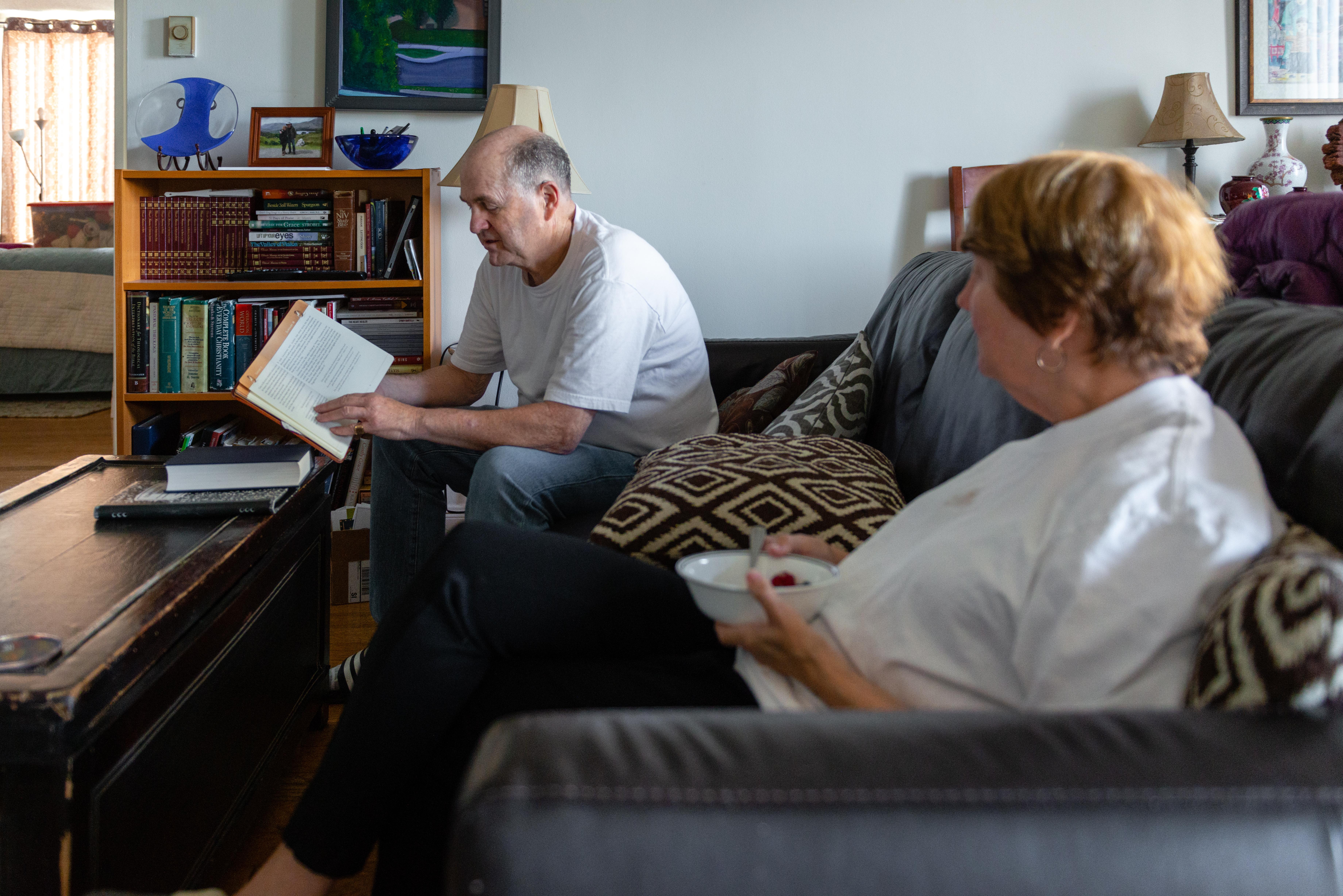 Every morning, Doug reads Connie Scriptures from the Bible while she eats breakfast. Doug says his faith has remained solid through the process of caring for his wife. “Not to say that there are not moments when I come to tears,” he says. “But I can see her faith is still there.”(Heidi de Marco/California Healthline)