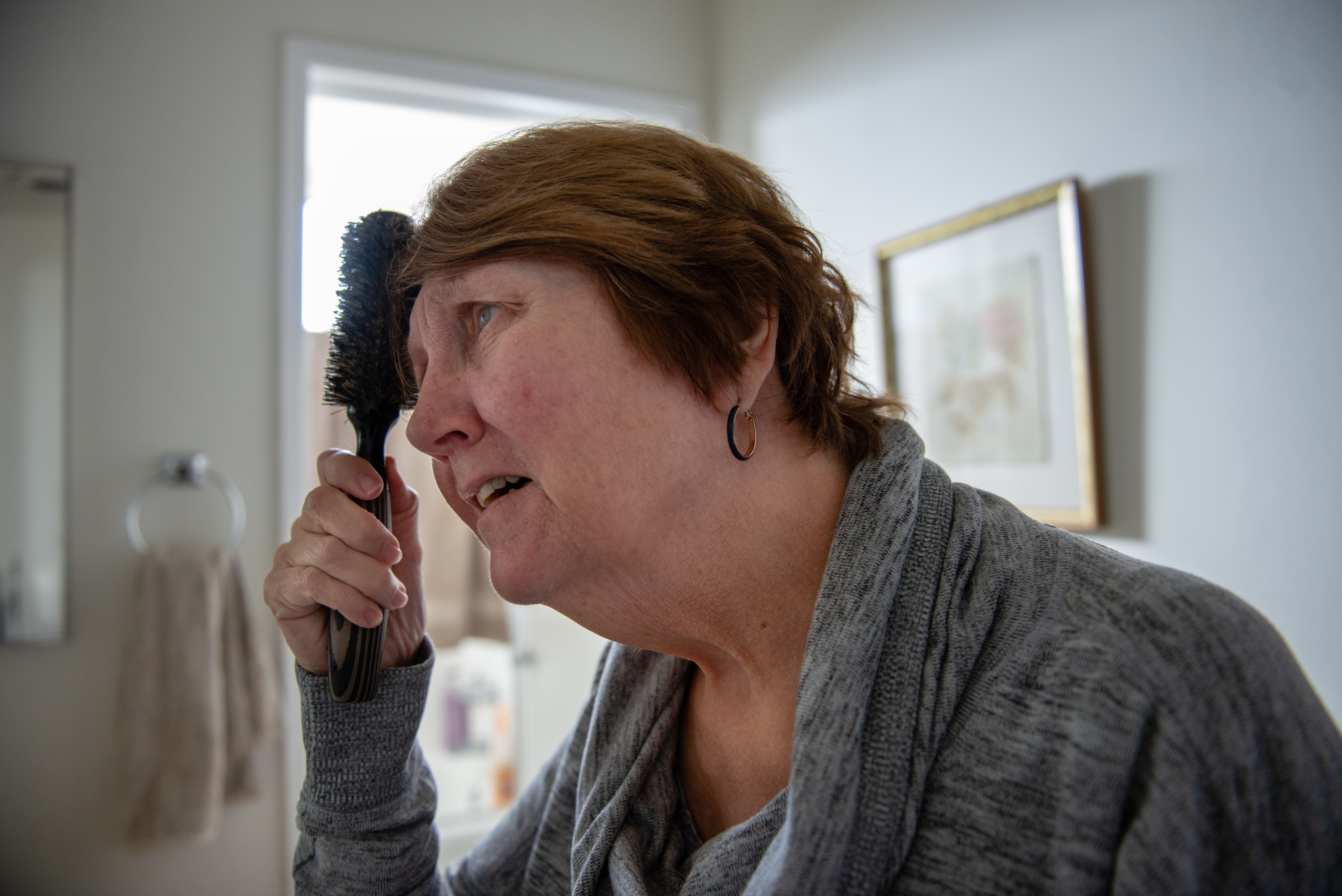 As Connie’s dementia progresses, dressing and grooming become harder for her. For now, she is still able to comb her hair and brush her teeth.(Heidi de Marco/California Healthline)