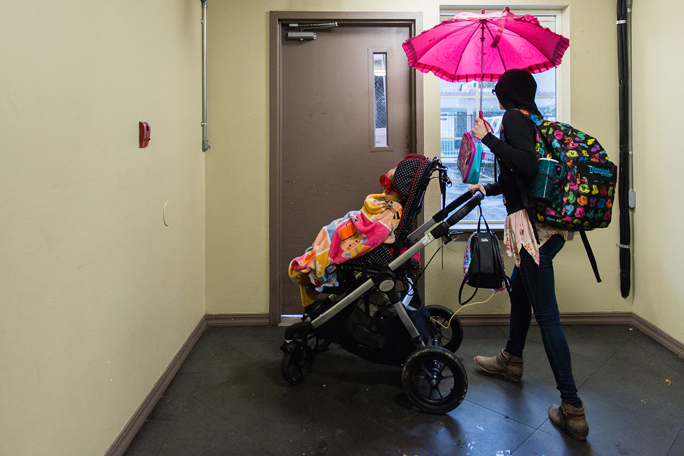 Meagan Holt wheels daughter Maddie outside for a ride to Seattle Children’s Hospital on Nov. 21, 2017. Holt doesn’t drive due to serious vision problems and can’t afford a car. (Heidi de Marco/California Healthline)