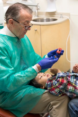 At a recent visit to UCSF’s Pediatric Dentistry Faculty Clinic, 18-month-old Sebastian King scrutinized the dental mirror Stewart handed to him.